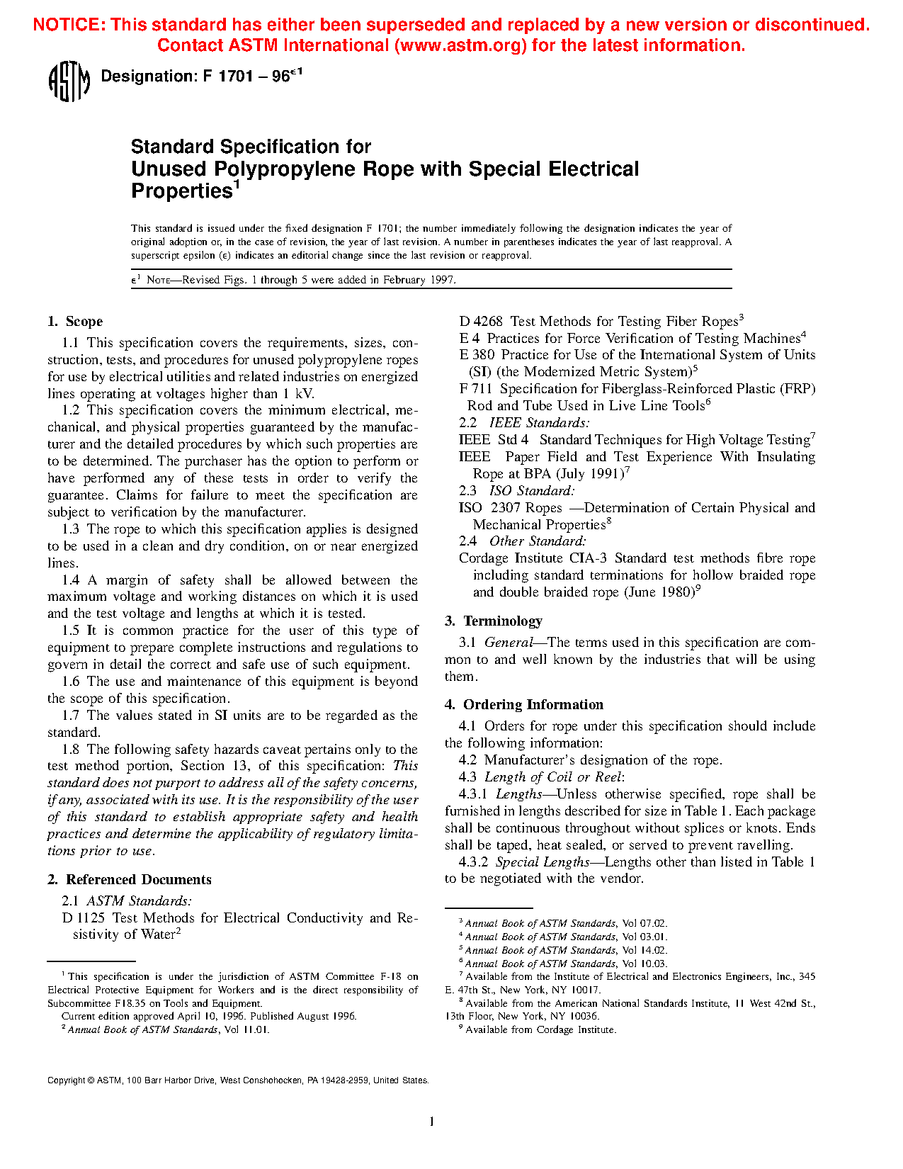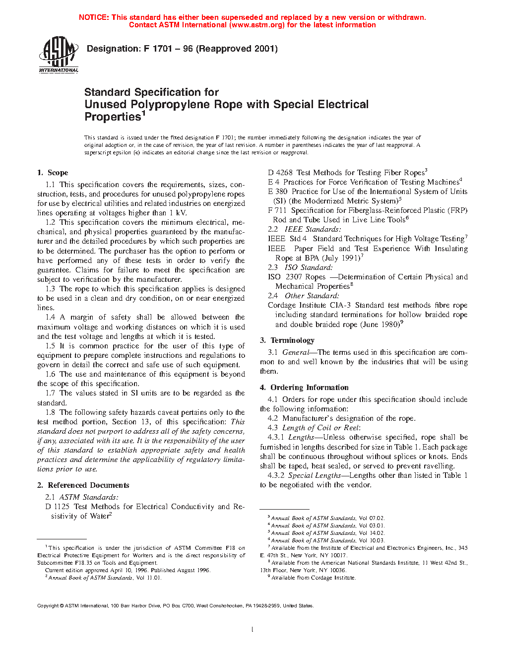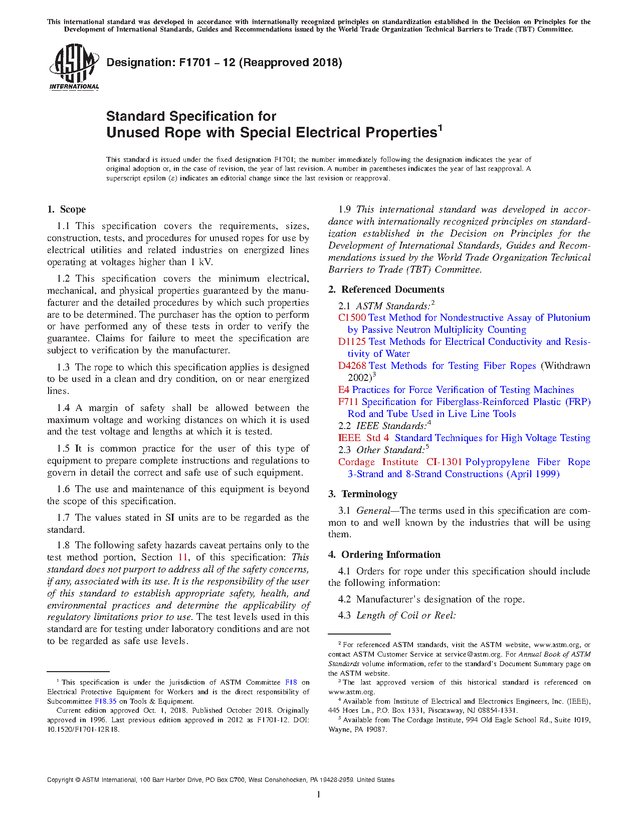 1.1 This specification covers the requirements, sizes, construction, tests, and procedures for unused ropes for use by electrical utilities and related industries on energized lines operating at voltages higher than 1 kV.