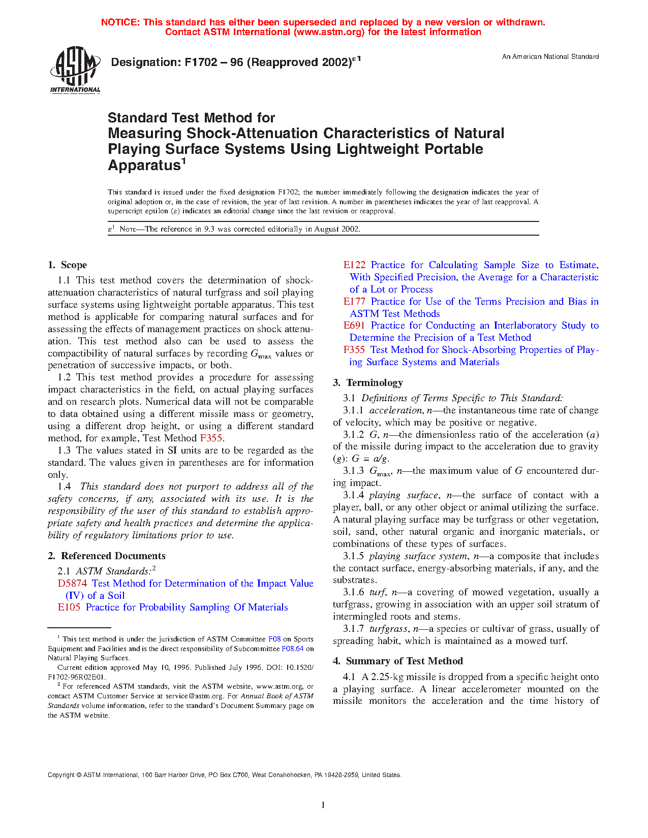 1.1 This test method is used to determine the impact-attenuation characteristics of natural turfgrass and soil playing surface systems with a lightweight portable apparatus. This test method can be used to compare the impact attenuation characteristics of natural playing surface systems, as well as assessing the effects of management practices on the impact attenuation characteristics. This test method also can be used to assess the compactibility of natural playing surfaces by recording g-max values or penetration of successive impacts, or both.