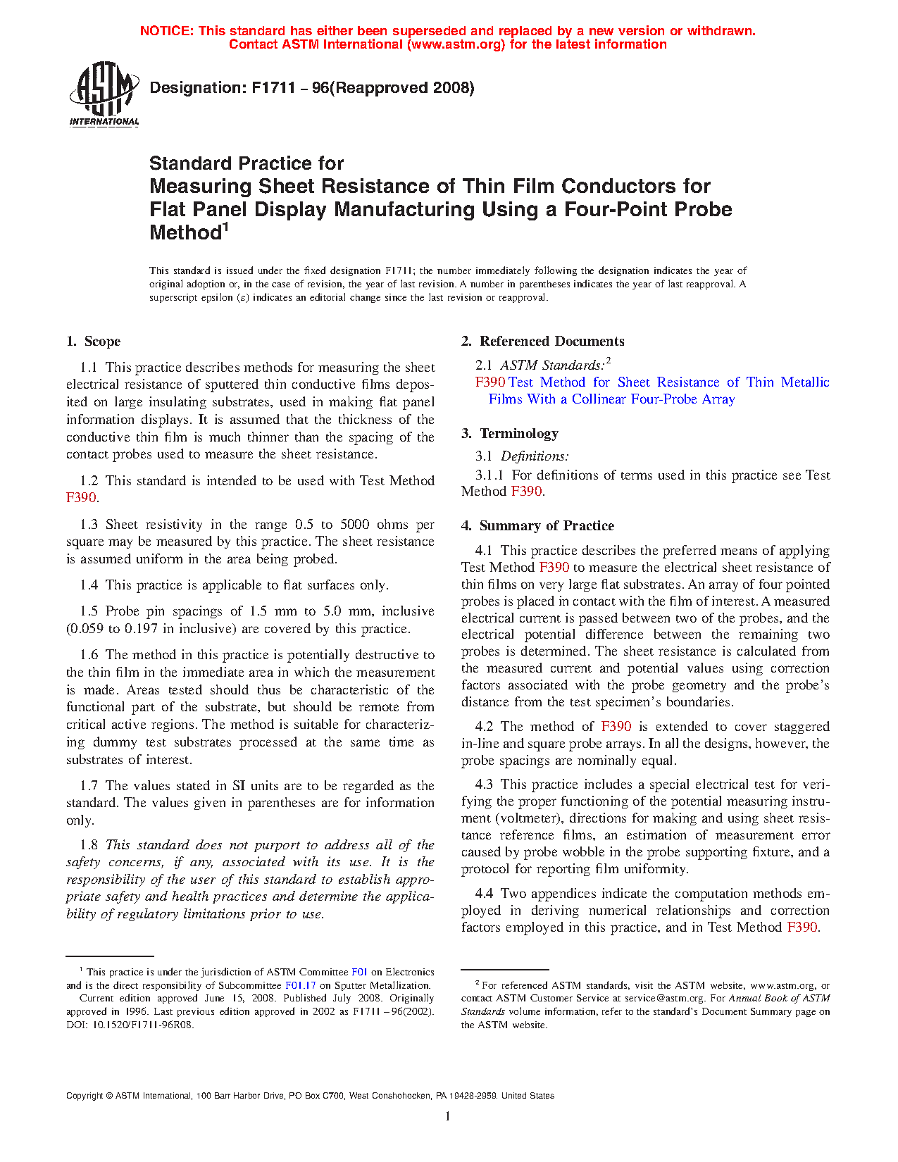 1.1 This practice describes methods for measuring the sheet electrical resistance of sputtered thin conductive films deposited on large insulating substrates, used in making flat panel information displays. It is assumed that the thickness of the conductive thin film is much thinner than the spacing of the contact probes used to measure the sheet resistance.