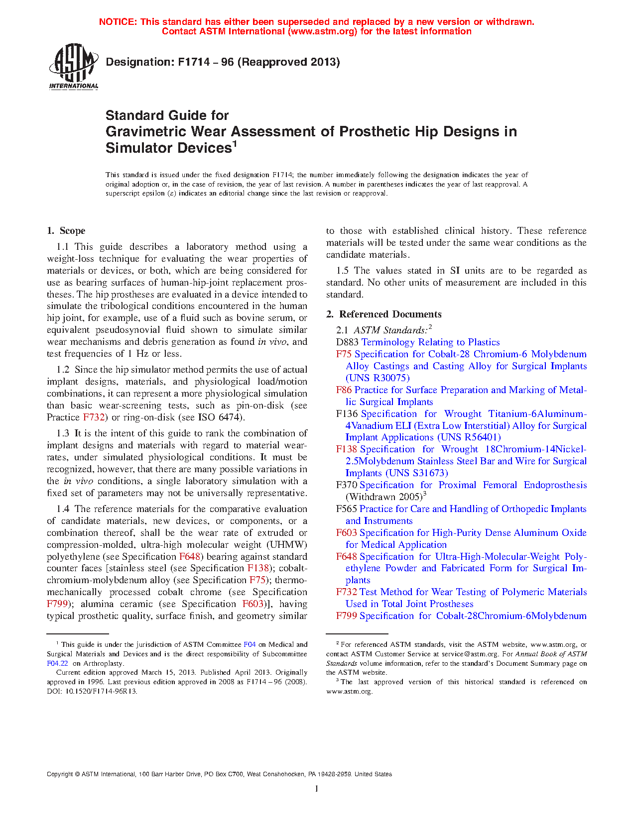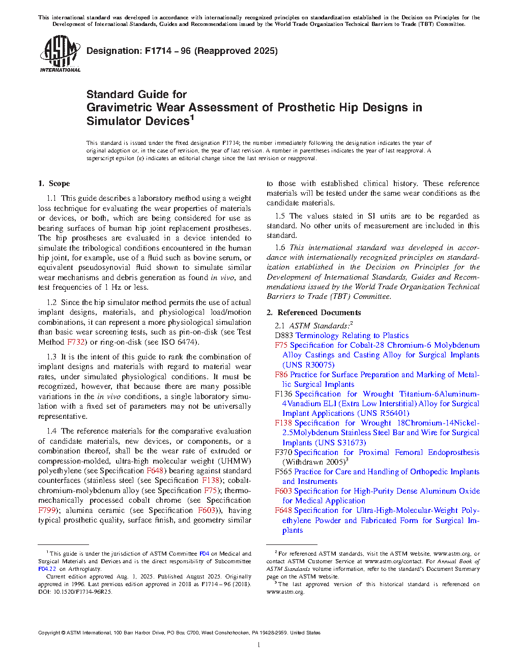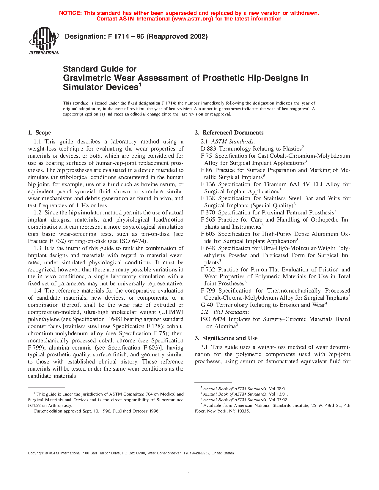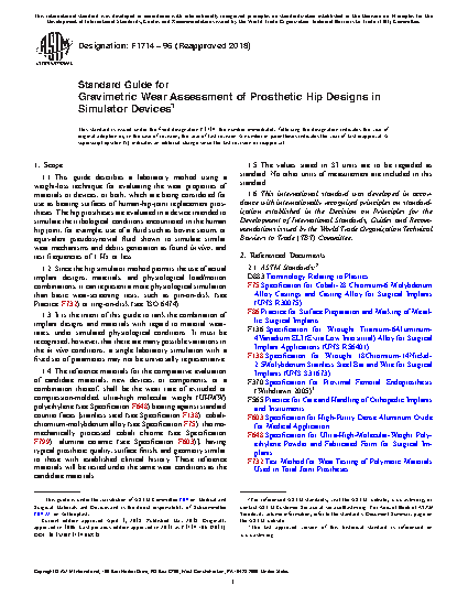 1.1 This guide describes a laboratory method using a weight-loss technique for evaluating the wear properties of materials or devices, or both, which are being considered for use as bearing surfaces of human-hip-joint replacement prostheses. The hip prostheses are evaluated in a device intended to simulate the tribological conditions encountered in the human hip joint, for example, use of a fluid such as bovine serum, or equivalent pseudosynovial fluid shown to simulate similar wear mechanisms and debris generation as found in vivo, and test frequencies of 1 Hz or less.