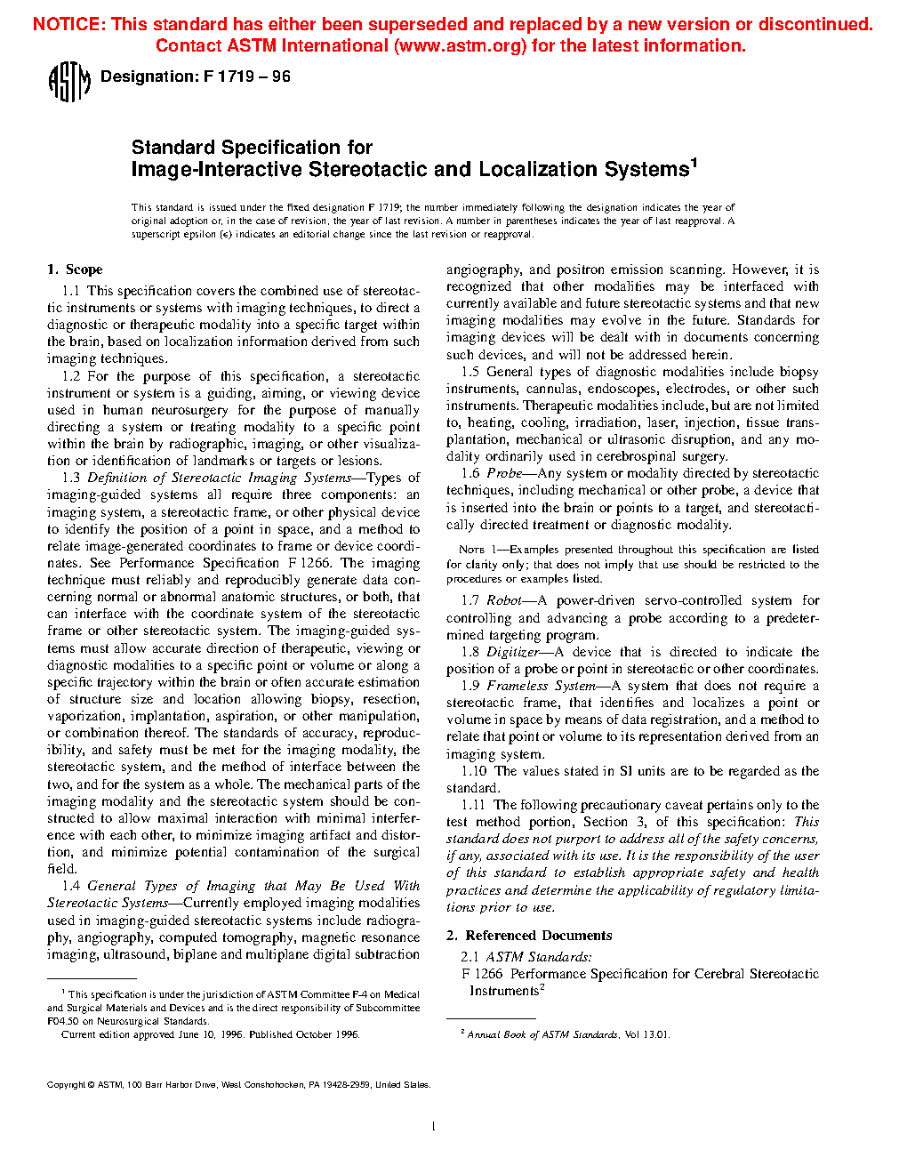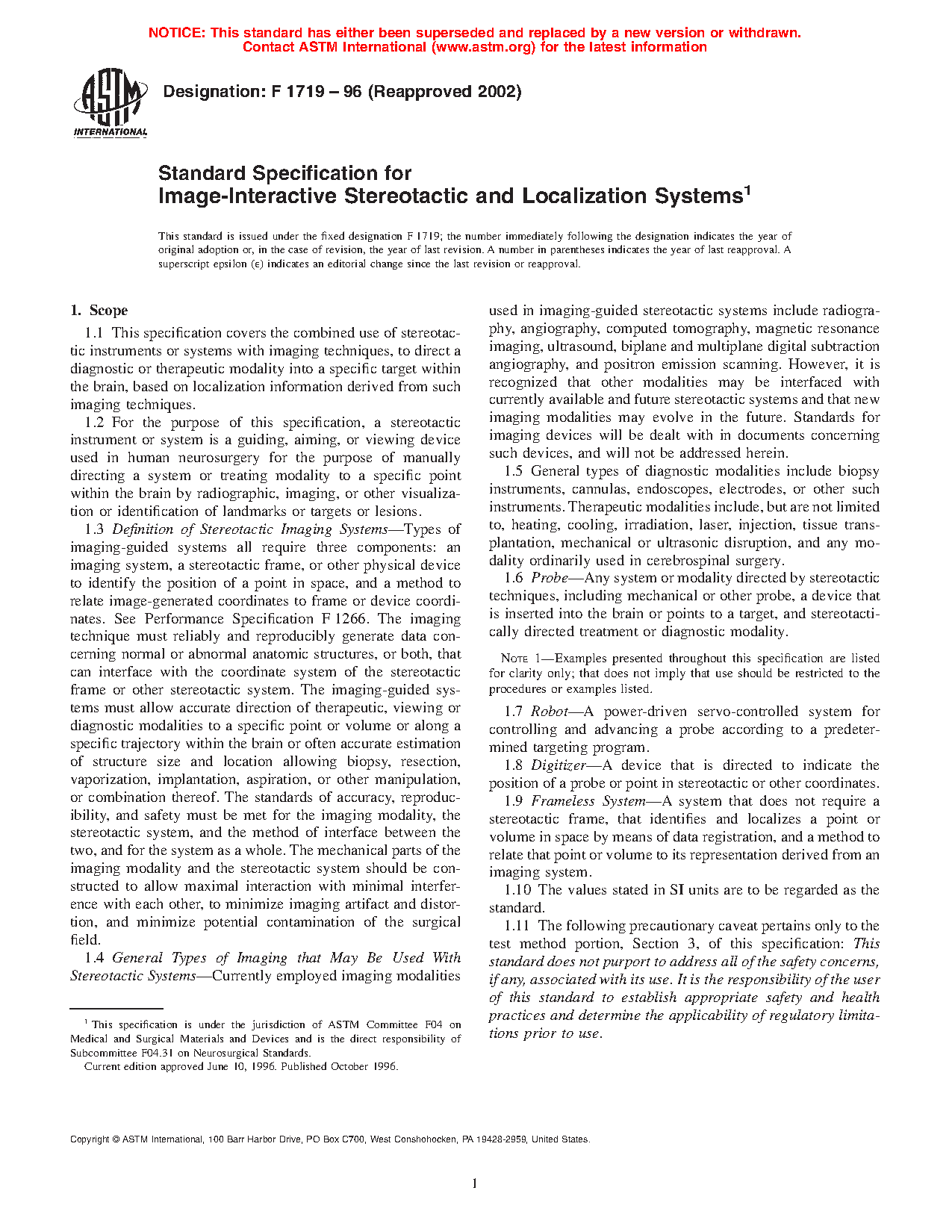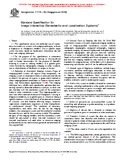 1.1 This specification covers the combined use of stereotactic instruments or systems with imaging techniques, to direct a diagnostic or therapeutic modality into a specific target within the brain, based on localization information derived from such imaging techniques.
