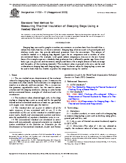 5.2 The measurement of the insulation provided by clothing (see Test Method F1291, ISO 15831) and sleeping bags (ISO 23537) is complex and dependent on the apparatus and techniques used. It is not practical in a test method of this scope to establish details sufficient to cover all contingencies. It is feasible that departures from the instructions in this test method will lead to significantly different test results. Technical knowledge concerning the theory of heat transfer, temperature and air motion measurement, and testing practices is needed to evaluate which departures from the instructions given in this test method are significant. Standardization of the method reduces, but does not eliminate, the need for such technical knowledge. Any departures need to be reported with the results.