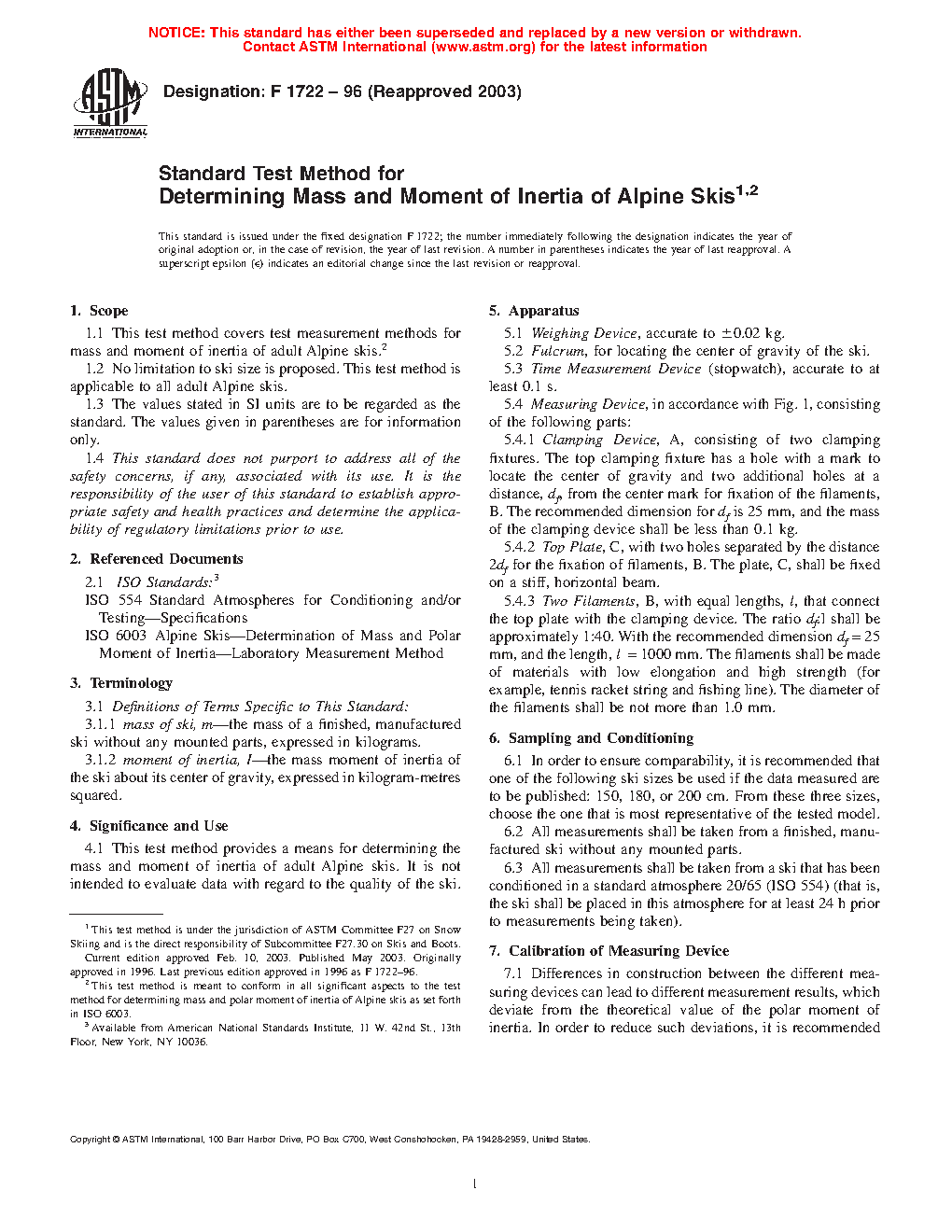 4.1 This test method provides a means for determining the mass and moment of inertia of adult Alpine skis. It is not intended to evaluate data with regard to the quality of the ski.