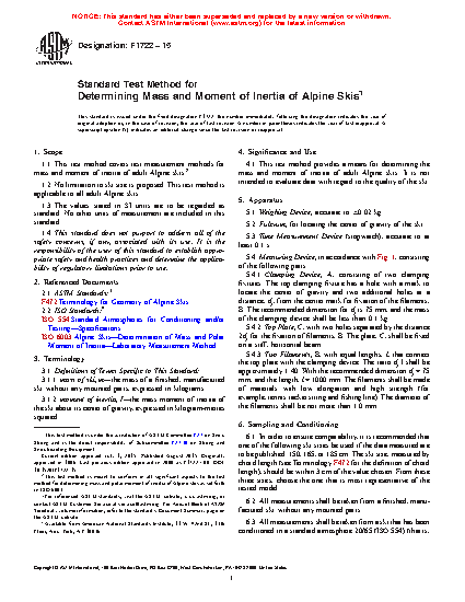 1.1 This test method covers test measurement methods for mass and moment of inertia of adult Alpine skis.2