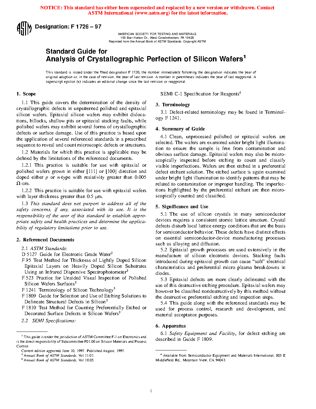 1.1 This guide covers the determination of the density of crystallographic defects in unpatterned polished and epitaxial silicon wafers. Epitaxial silicon wafers may exhibit dislocations, hillocks, shallow pits or epitaxial stacking faults, while polished wafers may exhibit several forms of crystallographic defects or surface damage. Use of this practice is based upon the application of several referenced standards in a prescribed sequence to reveal and count microscopic defects or structures.