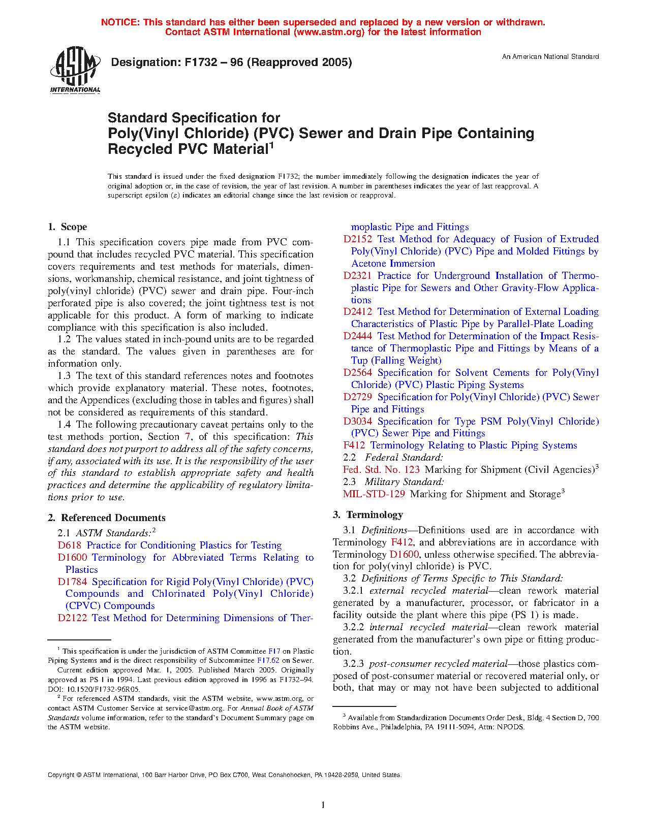1.1 This specification covers pipe made from PVC compound that includes recycled PVC material. This specification covers requirements and test methods for materials, dimensions, workmanship, chemical resistance, and joint tightness of poly(vinyl chloride) (PVC) sewer and drain pipe. Four-inch perforated pipe is also covered; the joint tightness test is not applicable for this product. A form of marking to indicate compliance with this specification is also included.
