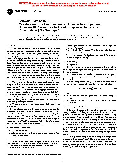 1.3 This practice is for use by squeeze-tool manufacturers, pipe manufacturers and gas utilities to qualify squeeze tools made in accordance with Specification F1563; and squeeze-off procedures in accordance with Guide F1041 with pipe manufactured in accordance with Specification D2513.