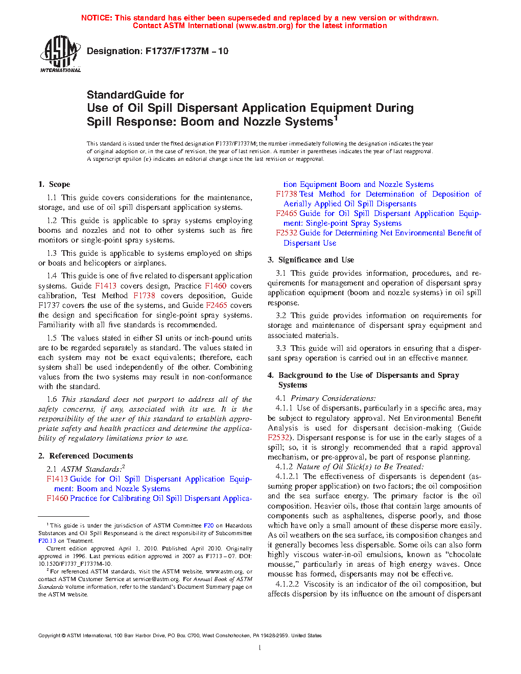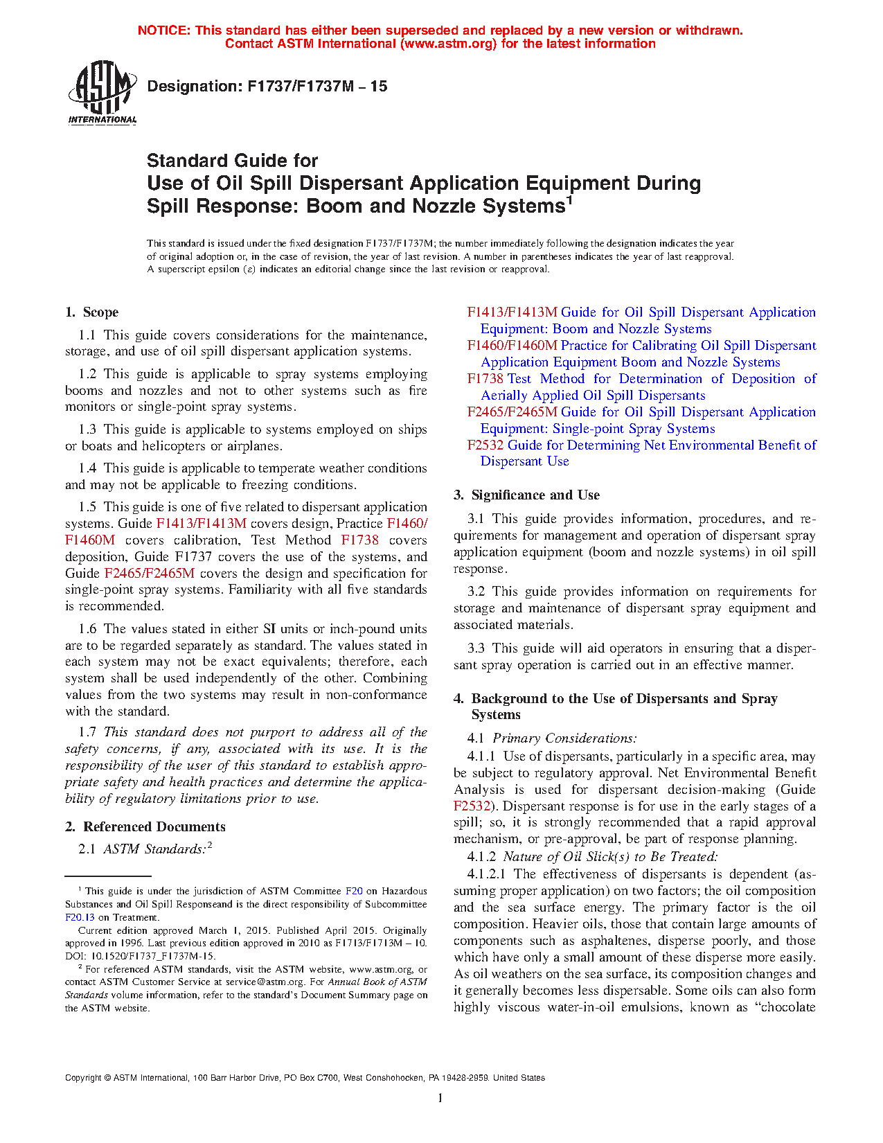 1.4 This guide is one of five related to dispersant application systems. Guide F1413 covers design, Practice F1460 covers calibration, Test Method F1738 covers deposition, Guide F1737 covers the use of the systems, and Guide F2465 covers the design and specification for single-point spray systems. Familiarity with all five standards is recommended.