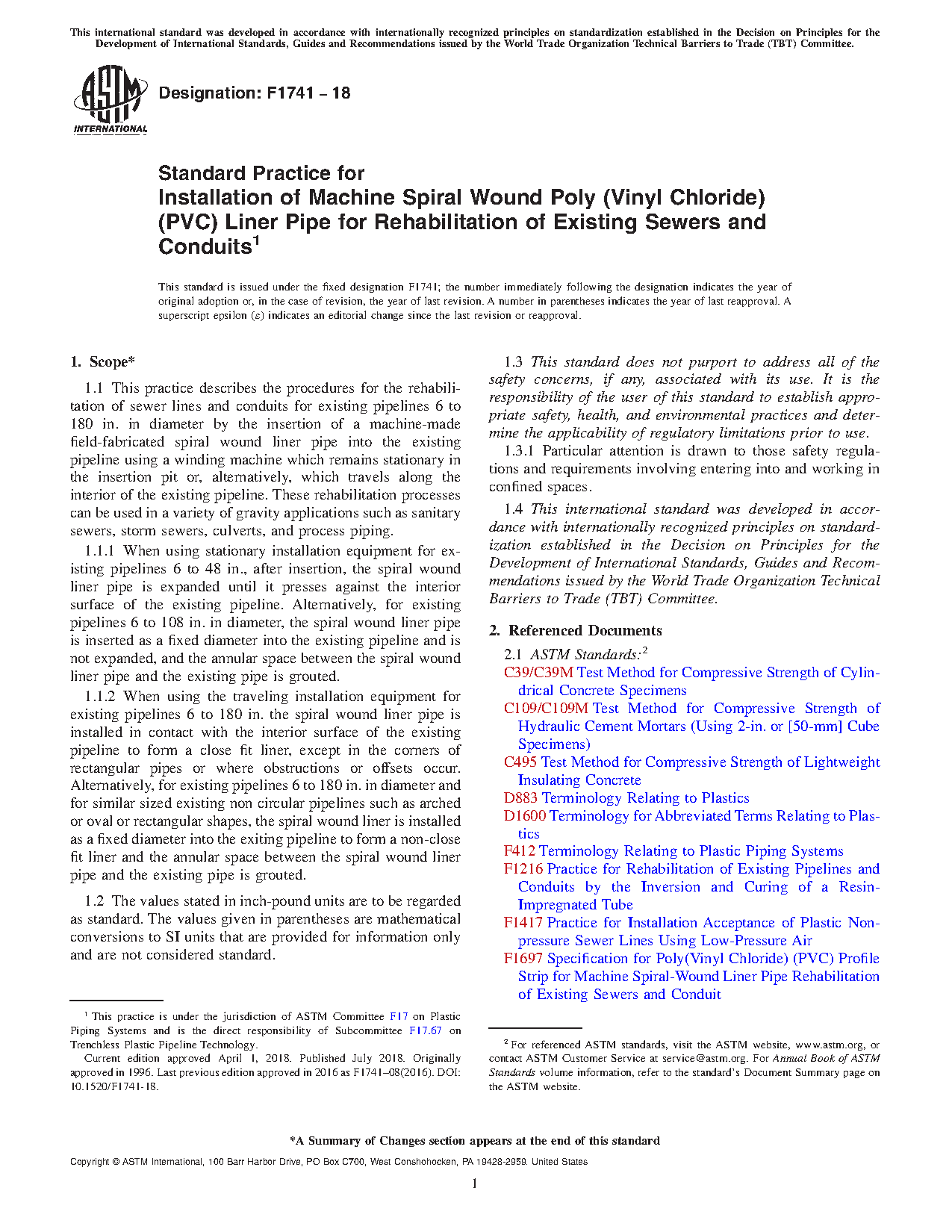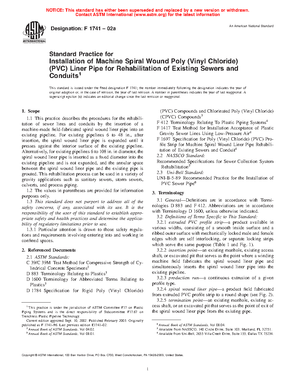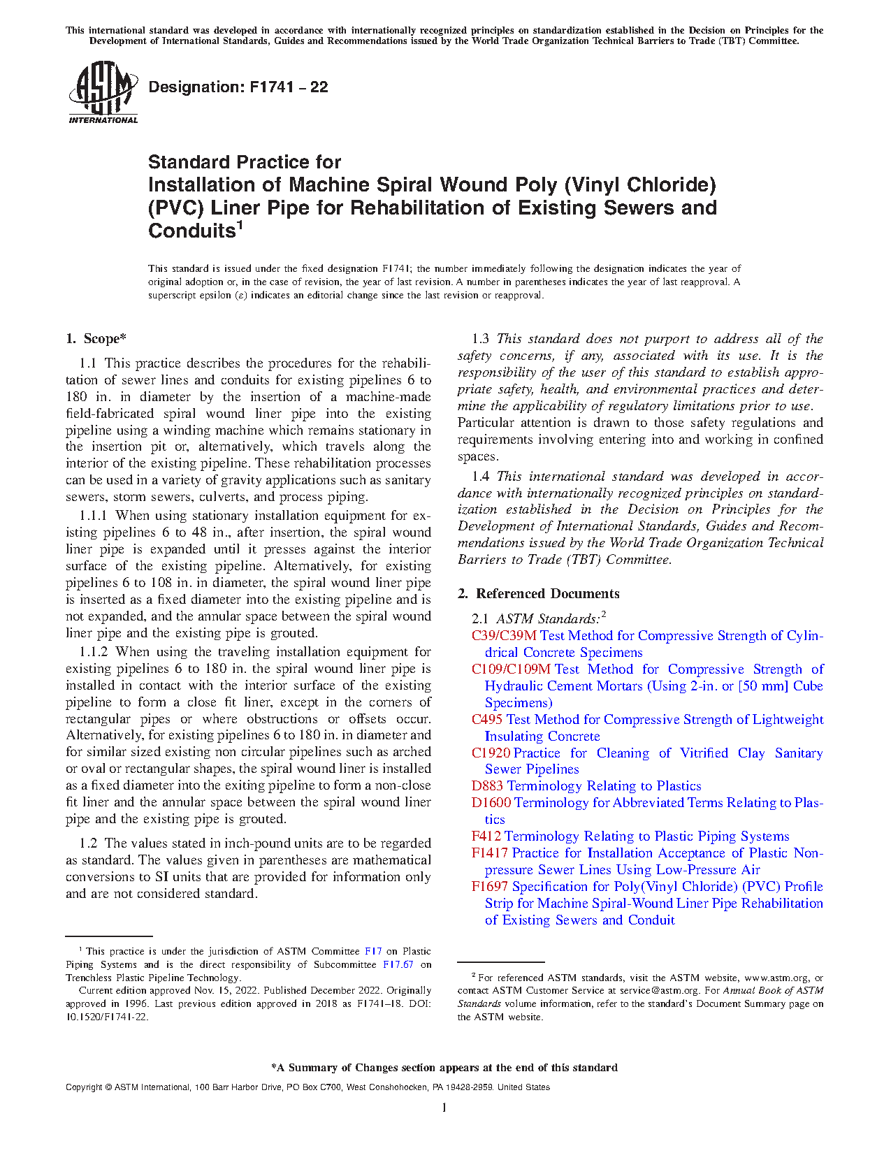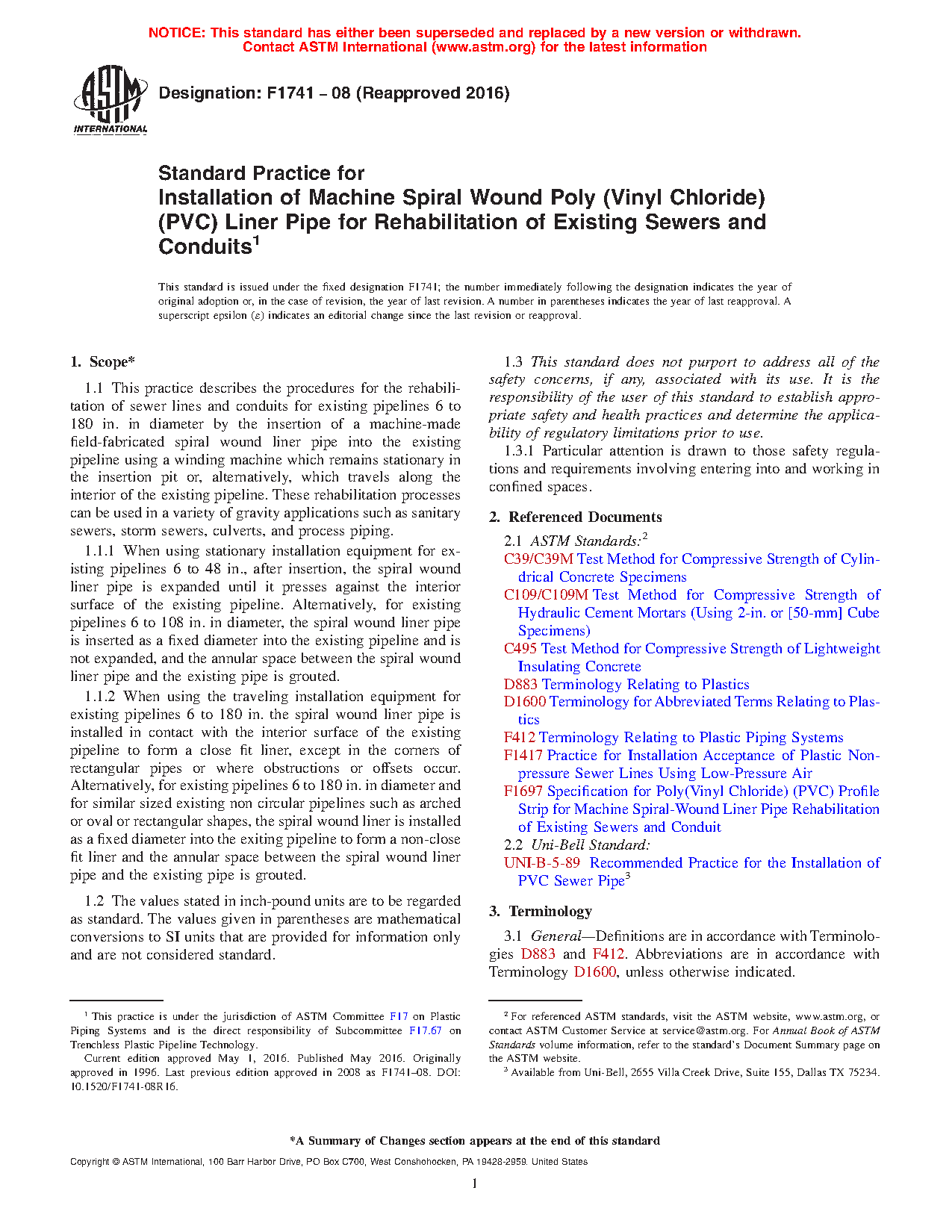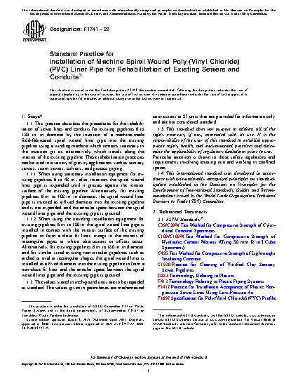 1.1 This practice describes the procedures for the rehabilitation of sewer lines and conduits by the insertion of a machine-made field-fabricated spiral wound liner pipe into an existing pipeline. For existing pipelines 6 to 48 in., after insertion, the spiral wound liner pipe is expanded until it presses against the interior surface of the existing pipeline. Alternatively, for existing pipelines 6 to 108 in. in diameter, the spiral wound liner pipe is inserted as a fixed diameter into the existing pipeline and is not expanded, and the annular space between the spiral wound liner pipe and the existing pipe is grouted. This rehabilitation process can be used in a variety of gravity applications such as sanitary sewers, storm sewers, culverts, and process piping.