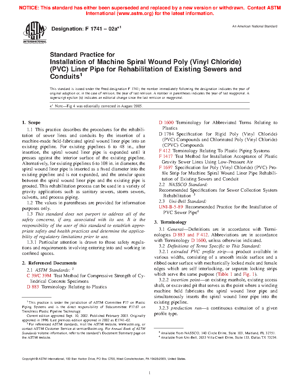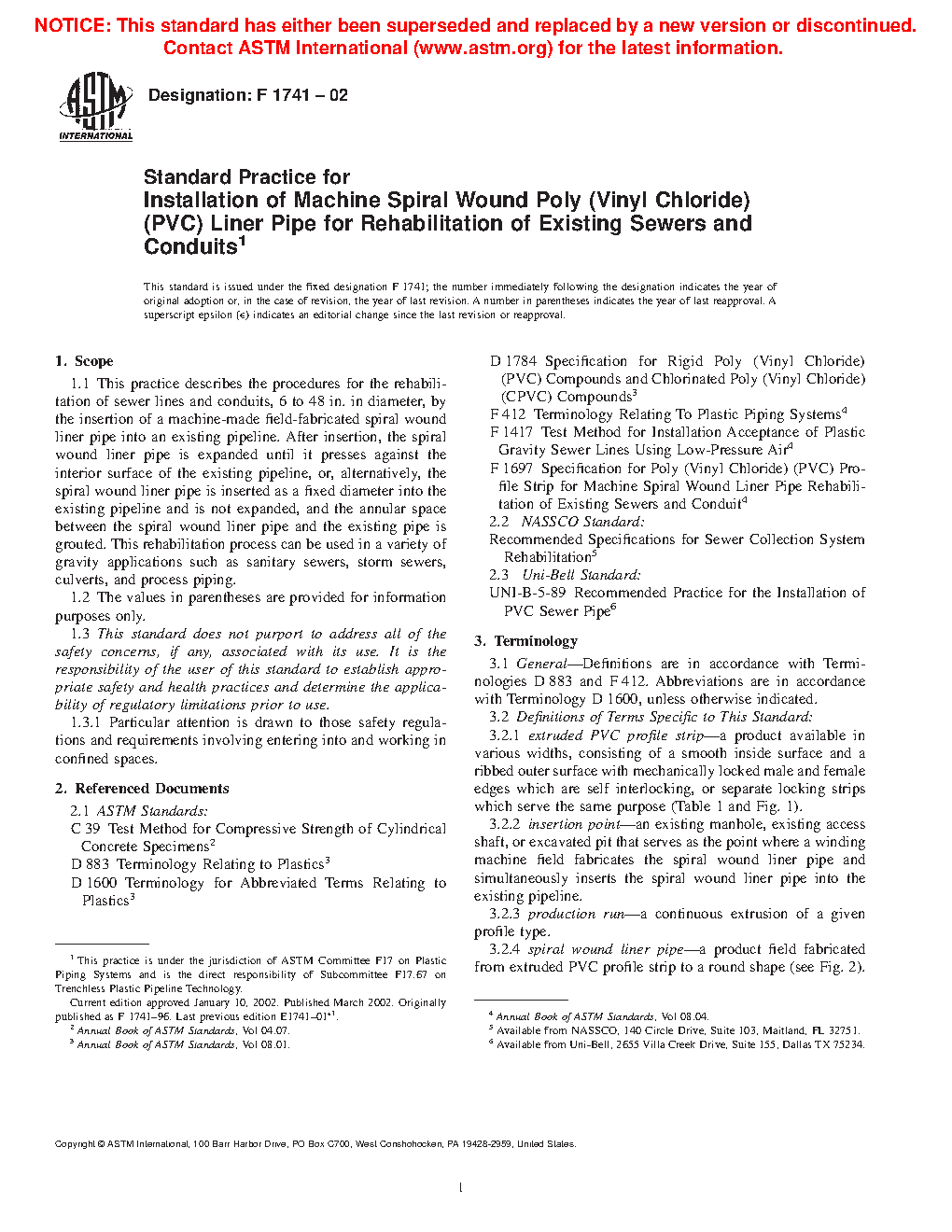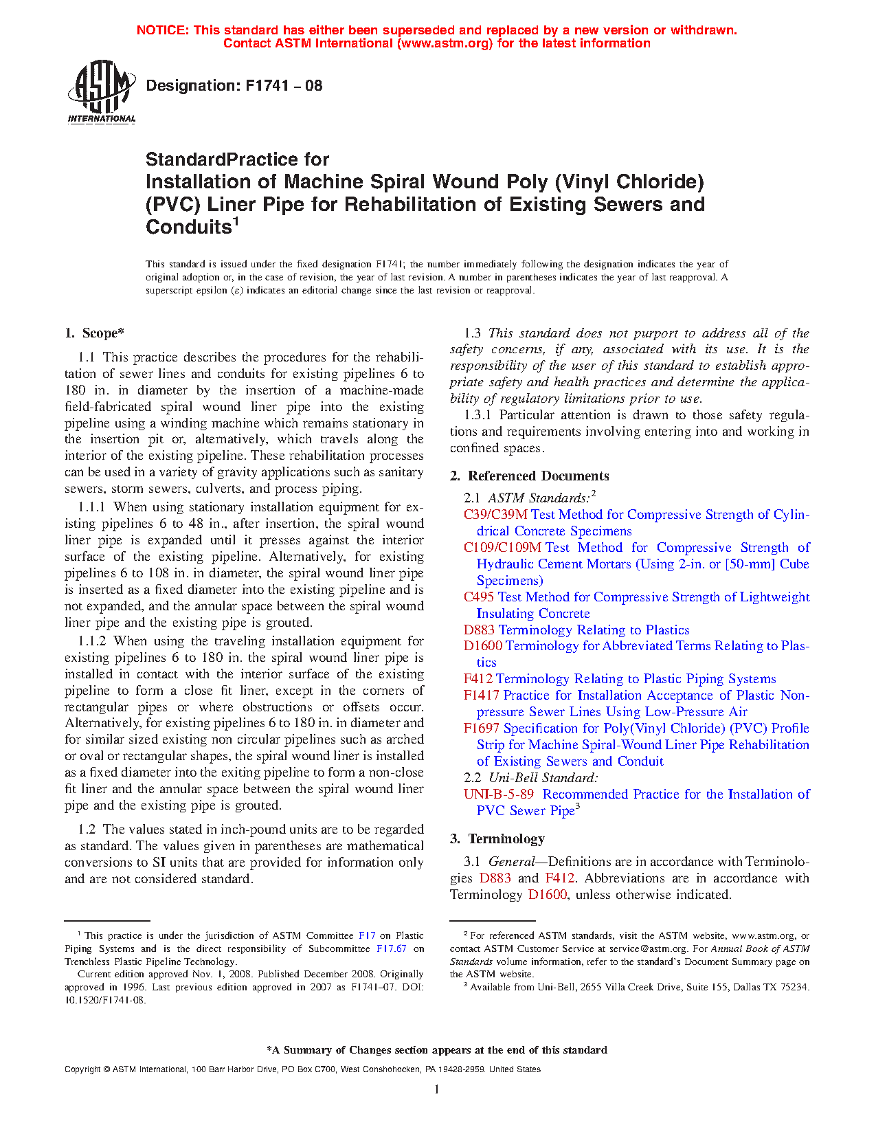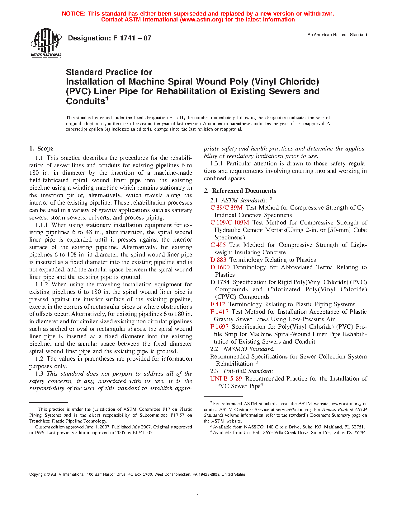 1.1 This practice describes the procedures for the rehabilitation of sewer lines and conduits by the insertion of a machine-made field-fabricated spiral wound liner pipe into an existing pipeline. For existing pipelines 6 to 48 in., after insertion, the spiral wound liner pipe is expanded until it presses against the interior surface of the existing pipeline. Alternatively, for existing pipelines 6 to 108 in. in diameter, the spiral wound liner pipe is inserted as a fixed diameter into the existing pipeline and is not expanded, and the annular space between the spiral wound liner pipe and the existing pipe is grouted. This rehabilitation process can be used in a variety of gravity applications such as sanitary sewers, storm sewers, culverts, and process piping.