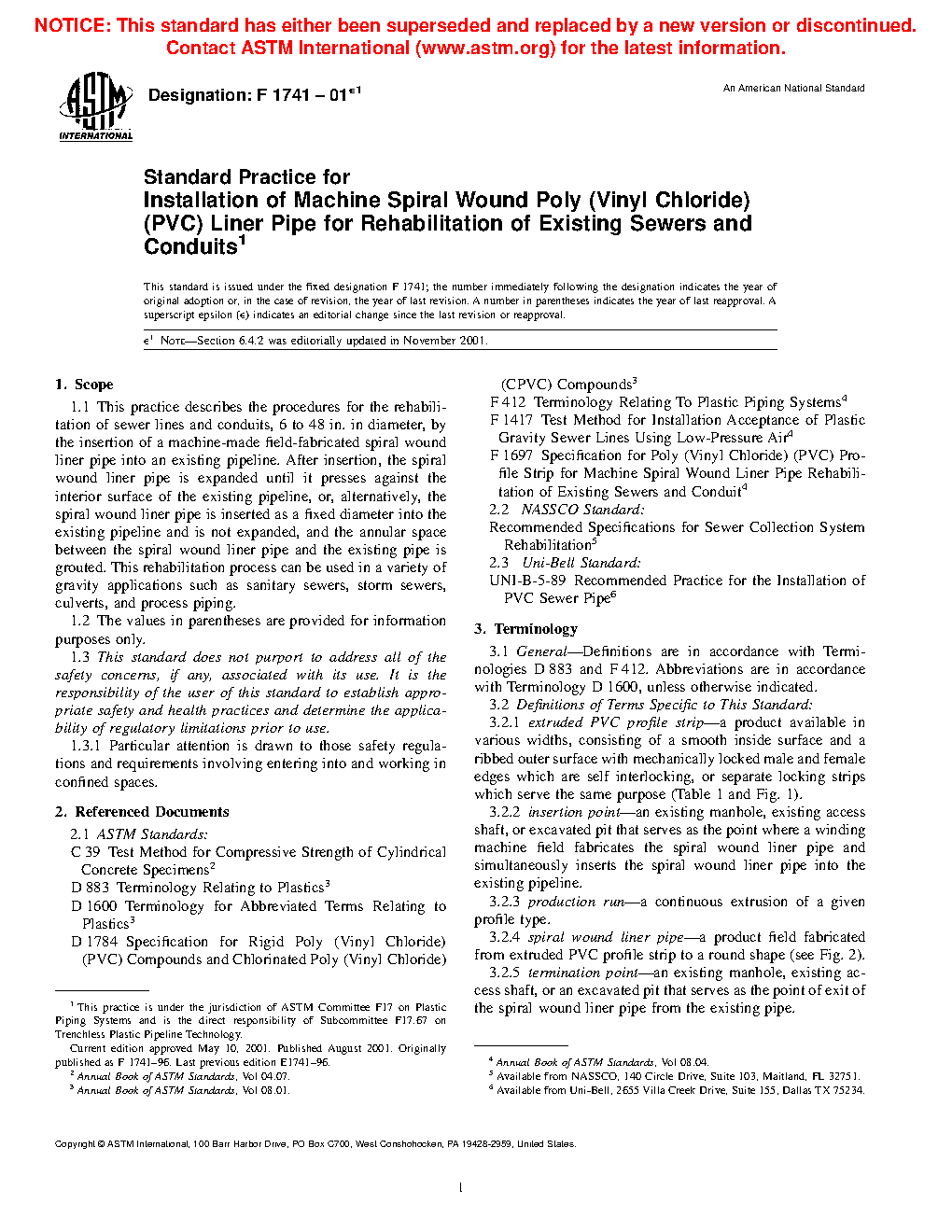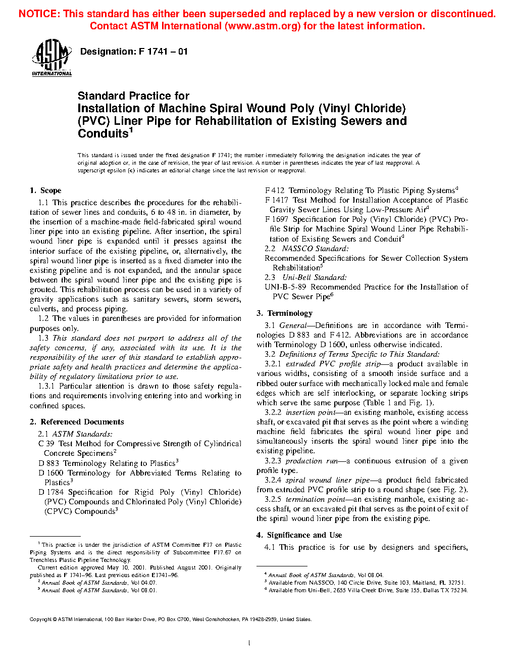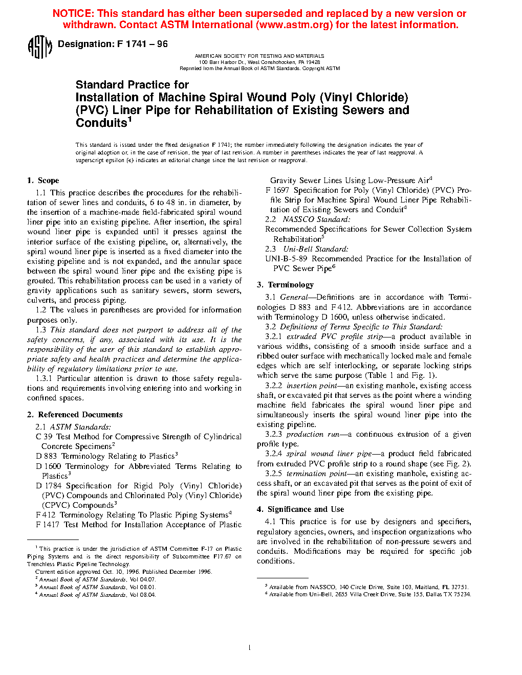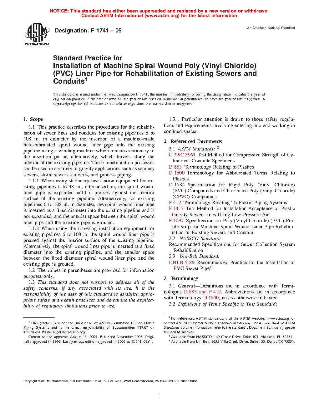 1.1 This practice describes the procedures for the rehabilitation of sewer lines and conduits by the insertion of a machine-made field-fabricated spiral wound liner pipe into an existing pipeline. For existing pipelines 6 to 48 in., after insertion, the spiral wound liner pipe is expanded until it presses against the interior surface of the existing pipeline. Alternatively, for existing pipelines 6 to 108 in. in diameter, the spiral wound liner pipe is inserted as a fixed diameter into the existing pipeline and is not expanded, and the annular space between the spiral wound liner pipe and the existing pipe is grouted. This rehabilitation process can be used in a variety of gravity applications such as sanitary sewers, storm sewers, culverts, and process piping.