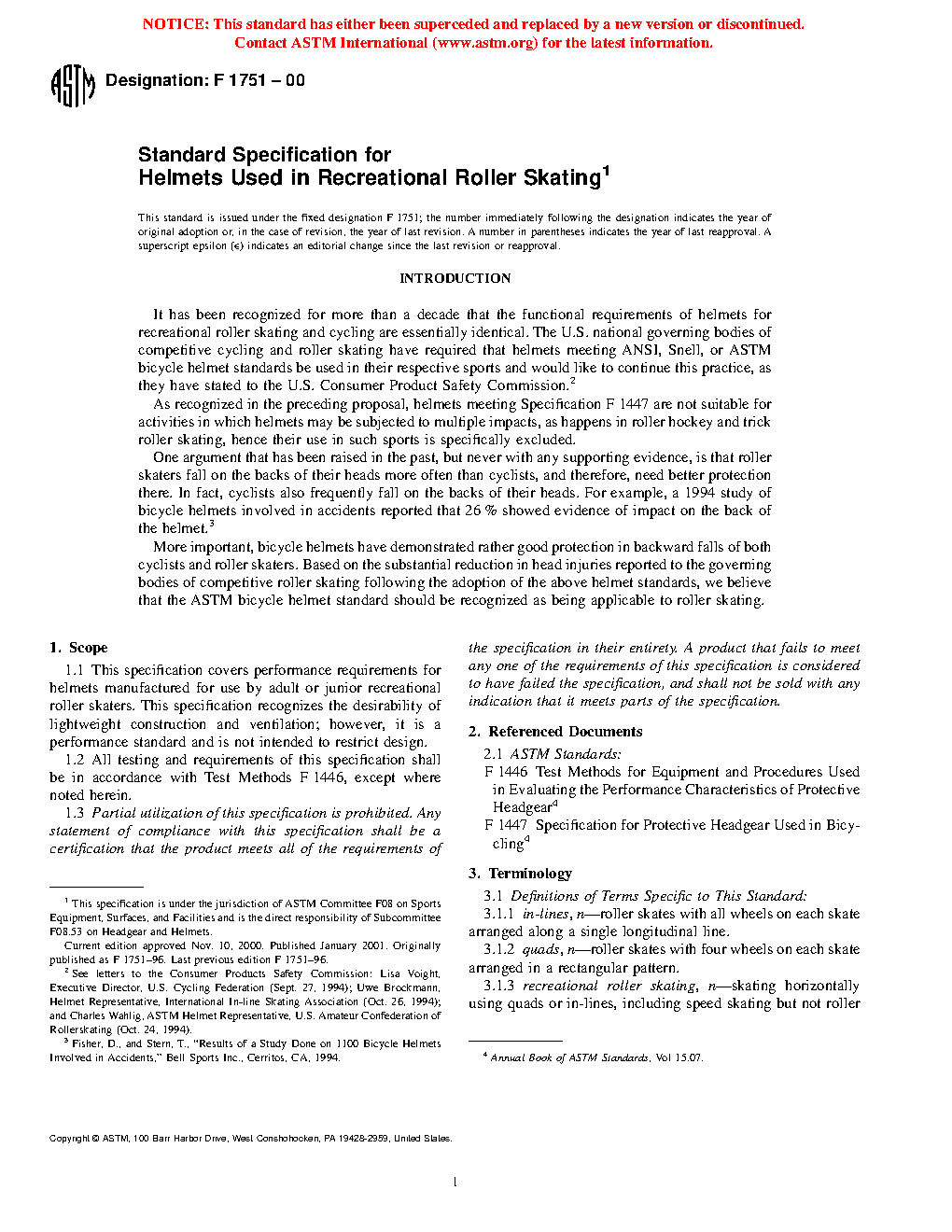 1.1 This specification covers performance requirements for helmets manufactured for use by adult or junior recreational roller skaters. This specification recognizes the desirability of lightweight construction and ventilation; however, it is a performance standard and is not intended to restrict design.