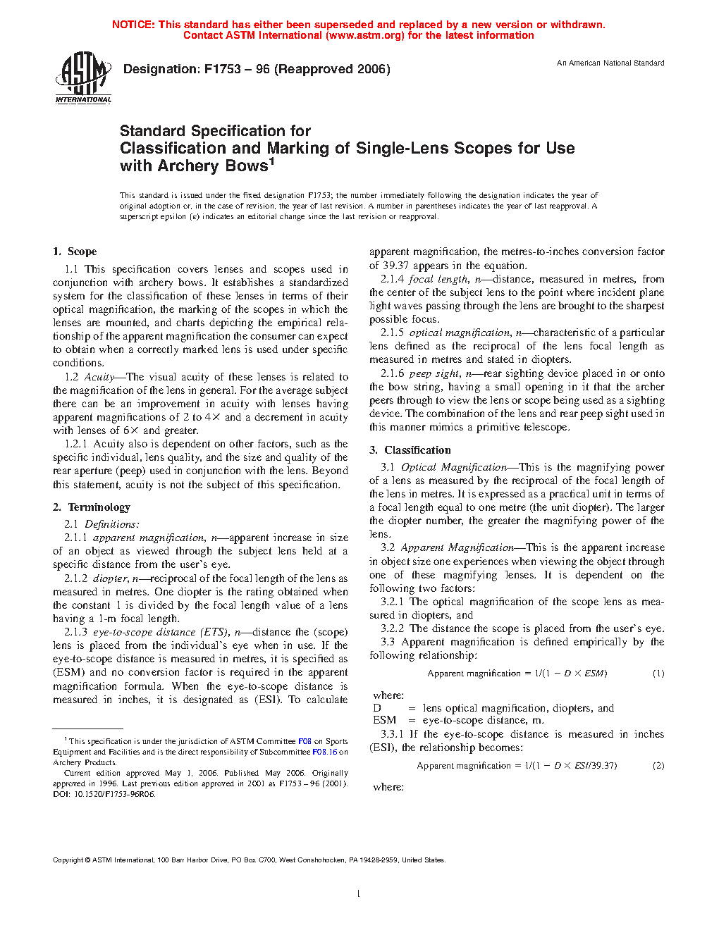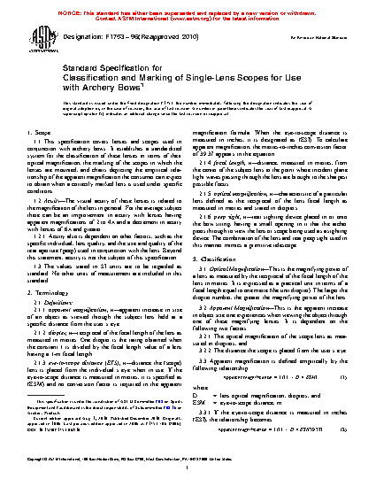 This specification covers the classification and marking of single-lens scopes used in conjunction with archery bows. The lenses are classified in terms of optical magnification, scope markings, and charts of the empirical relationship of the apparent magnification that the consumer can expect to obtain when a correctly marked lens is used under specific conditions. The visual acuity of the lenses is related to the magnification of the lens in general, and is dependent on other factors such as the specific individual, lens quality, and the size of the rear aperture used with the lens. This specification does not go beyond this definition of acuity.