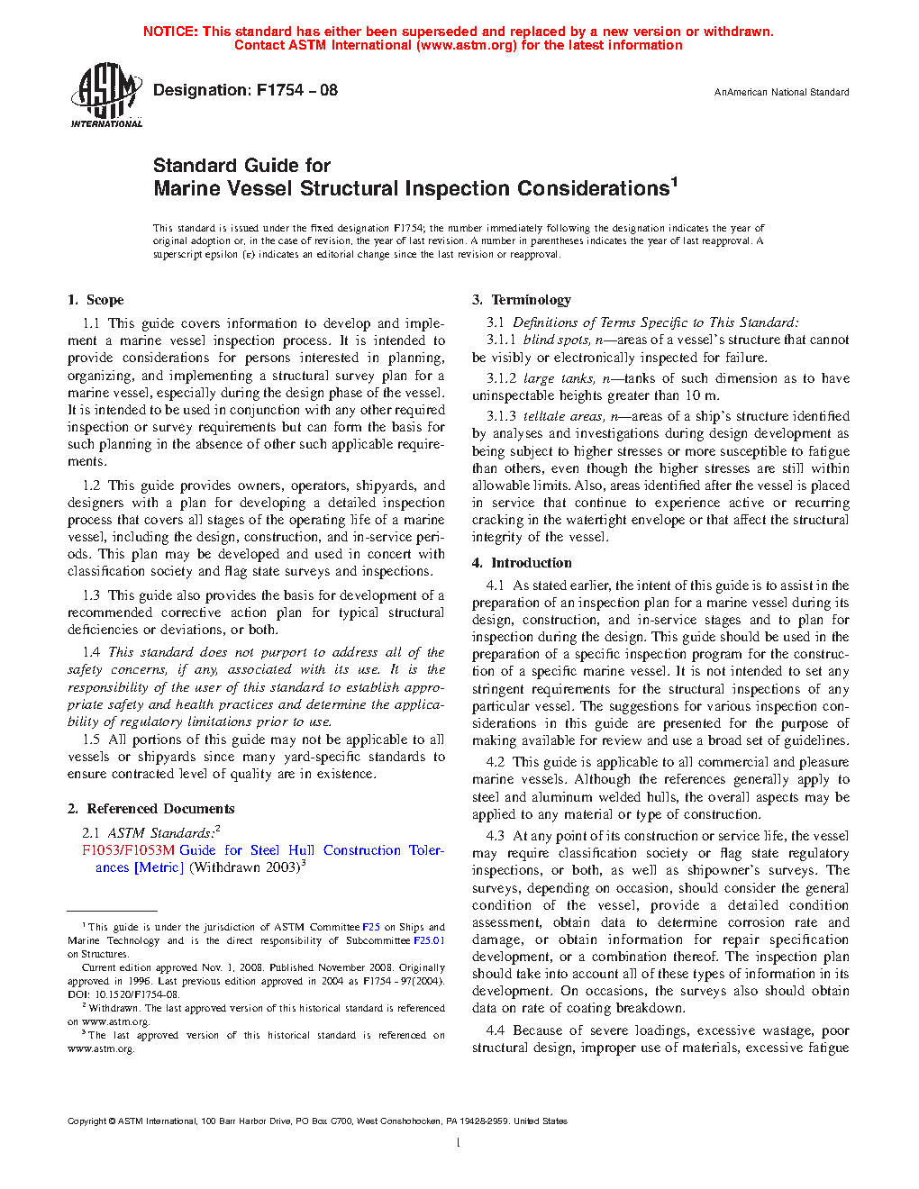 1.1 this guide provides information to develop and implement marine vessel inspection process. It is intended to provide considerations for persons interested in planning, organizing, and implementing a structural survey plan for a marine vessel especially during the design phase of the vessel. It is intended to be used in conjunction with any other required inspection or survey requirements but can form the basis for such planning in the absence of other such applicable requirements.