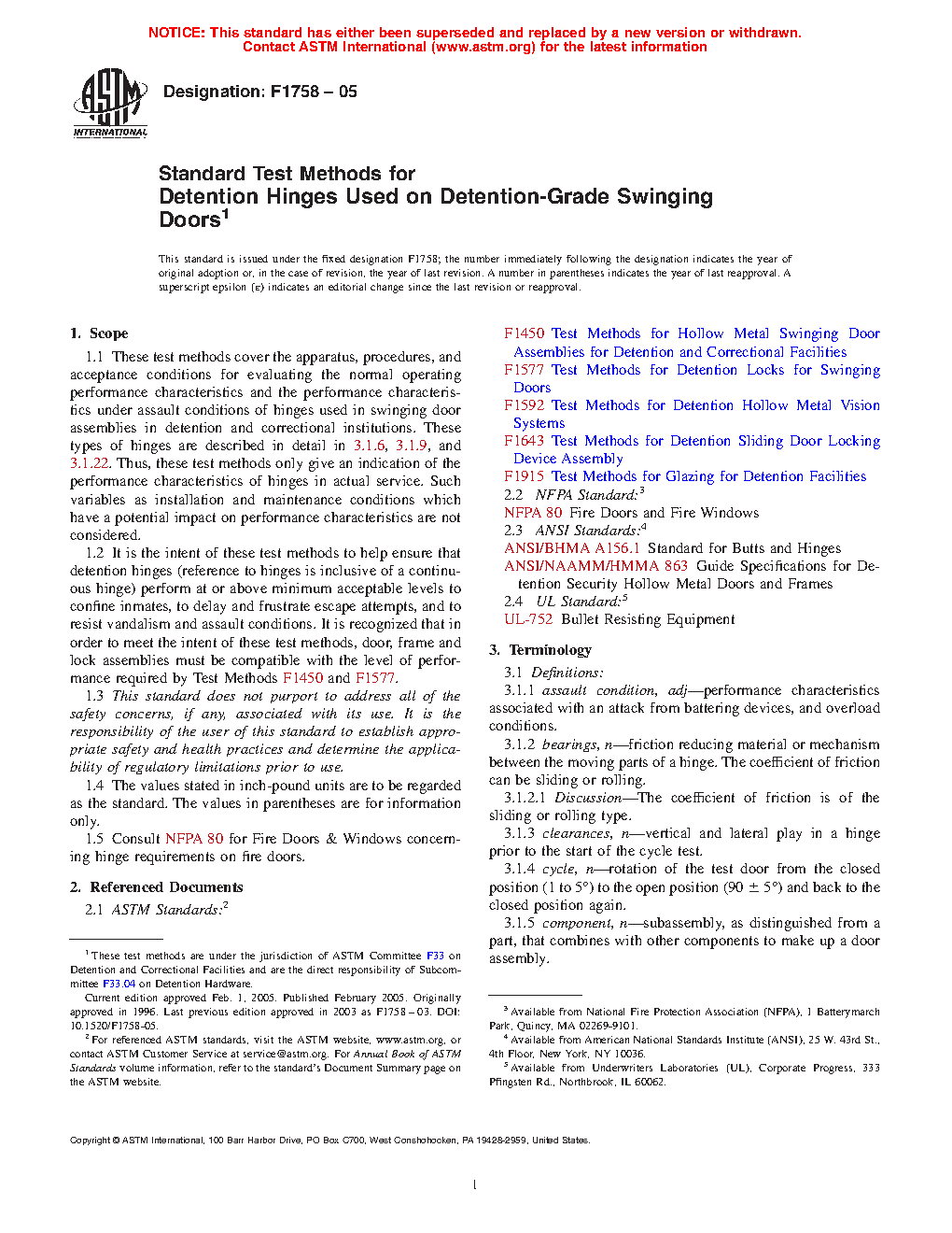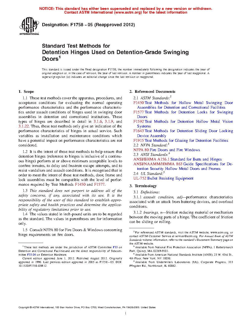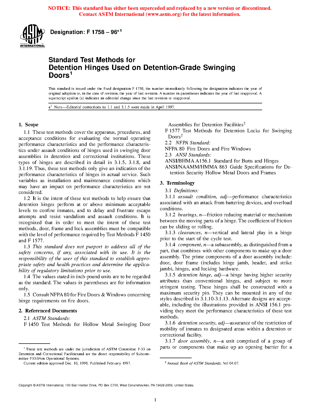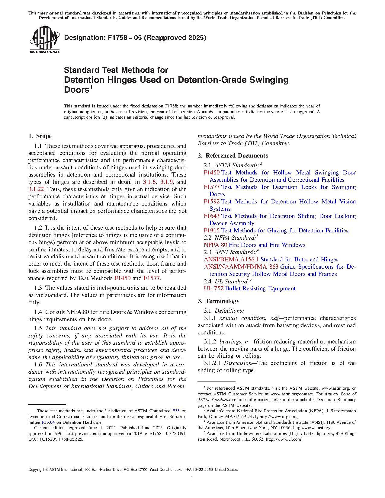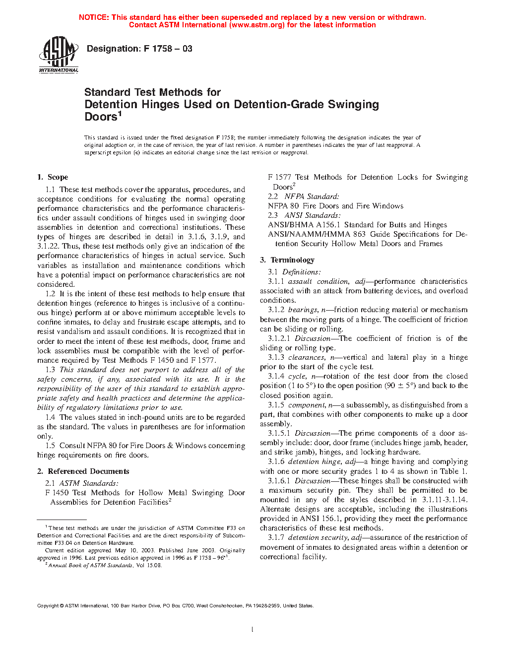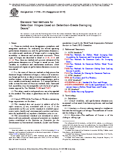 1.1 These test methods cover the apparatus, procedures, and acceptance conditions for evaluating the normal operating performance characteristics and the performance characteristics under assault conditions of hinges used in swinging door assemblies in detention and correctional institutions. These types of hinges are described in detail in 3.1.6, 3.1.9, and 3.1.22. Thus, these test methods only give an indication of the performance characteristics of hinges in actual service. Such variables as installation and maintenance conditions which have a potential impact on performance characteristics are not considered.