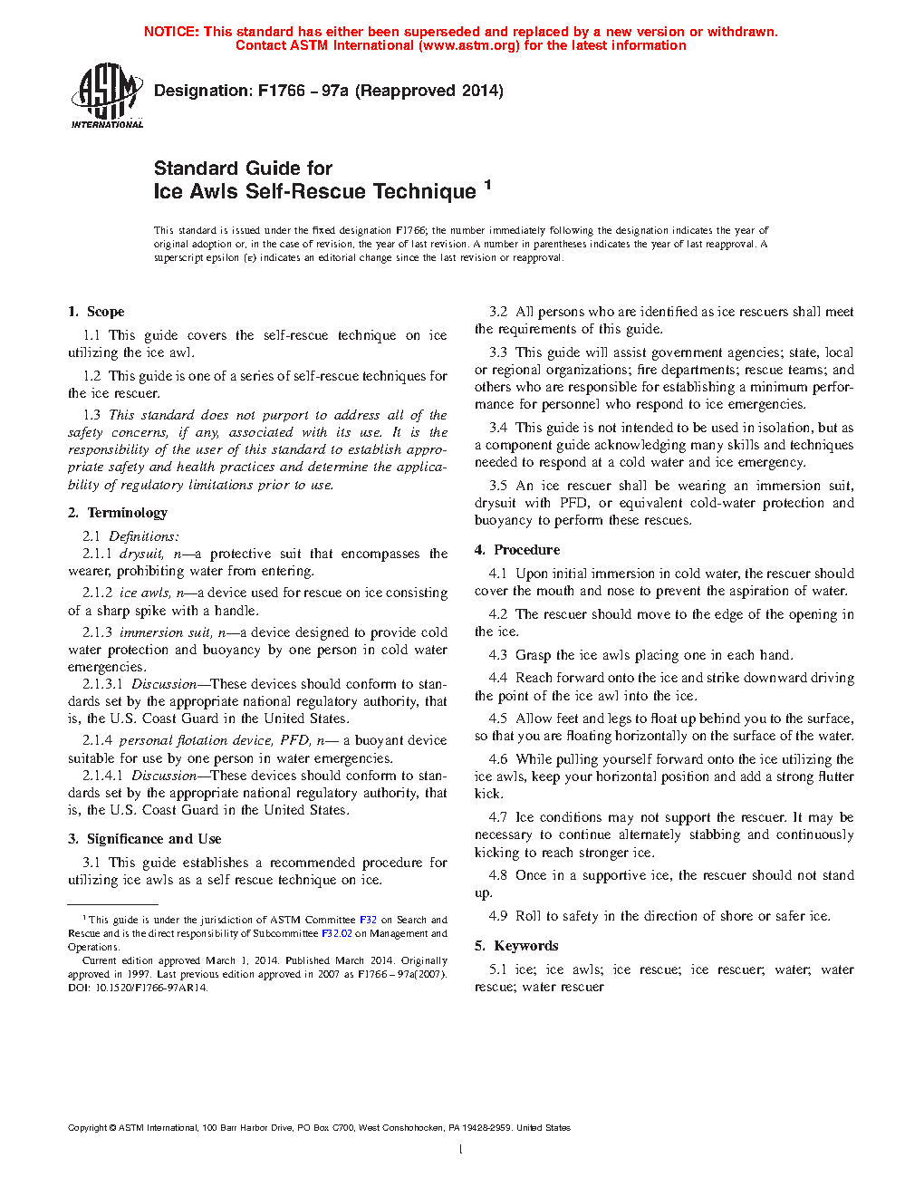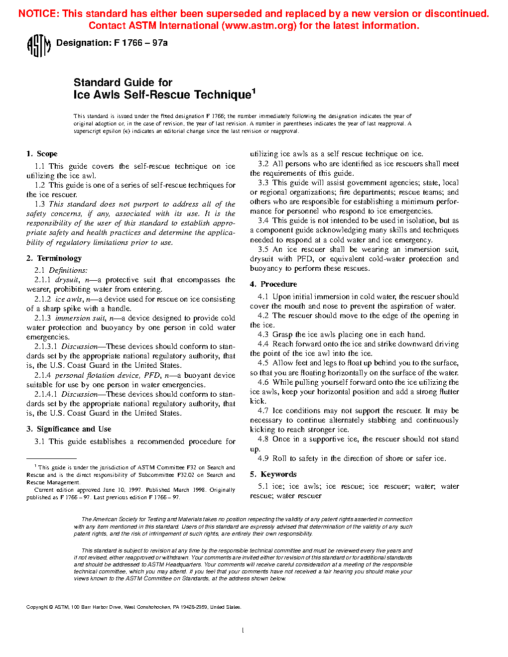 3.1 This guide establishes a recommended procedure for utilizing ice awls as a self rescue technique on ice.