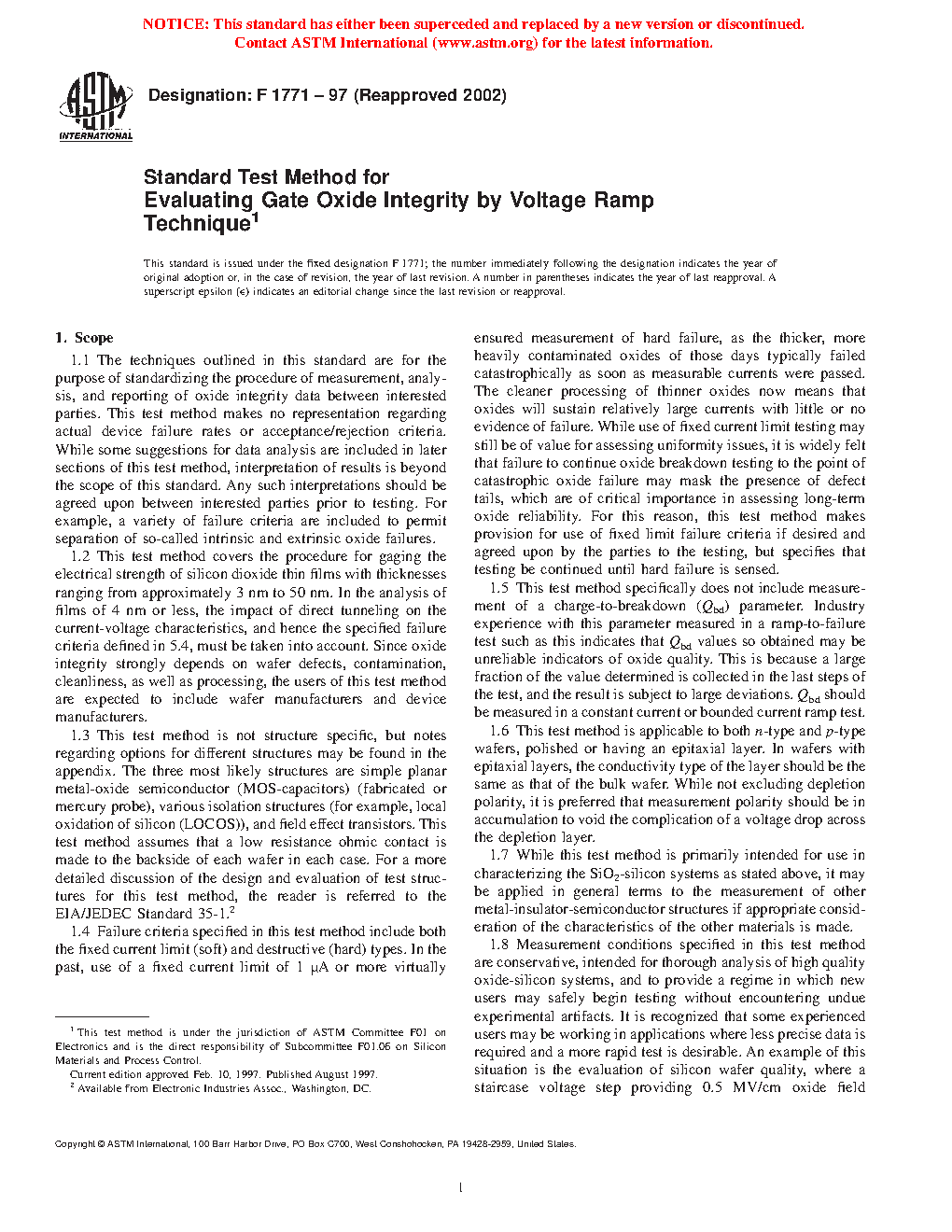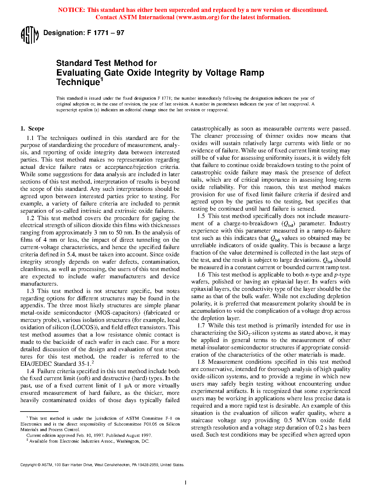 1.1 The techniques outlined in this standard are for the purpose of standardizing the procedure of measurement, analysis, and reporting of oxide integrity data between interested parties. This test method makes no representation regarding actual device failure rates or acceptance/rejection criteria. While some suggestions for data analysis are included in later sections of this test method, interpretation of results is beyond the scope of this standard. Any such interpretations should be agreed upon between interested parties prior to testing. For example, a variety of failure criteria are included to permit separation of so-called intrinsic and extrinsic oxide failures.