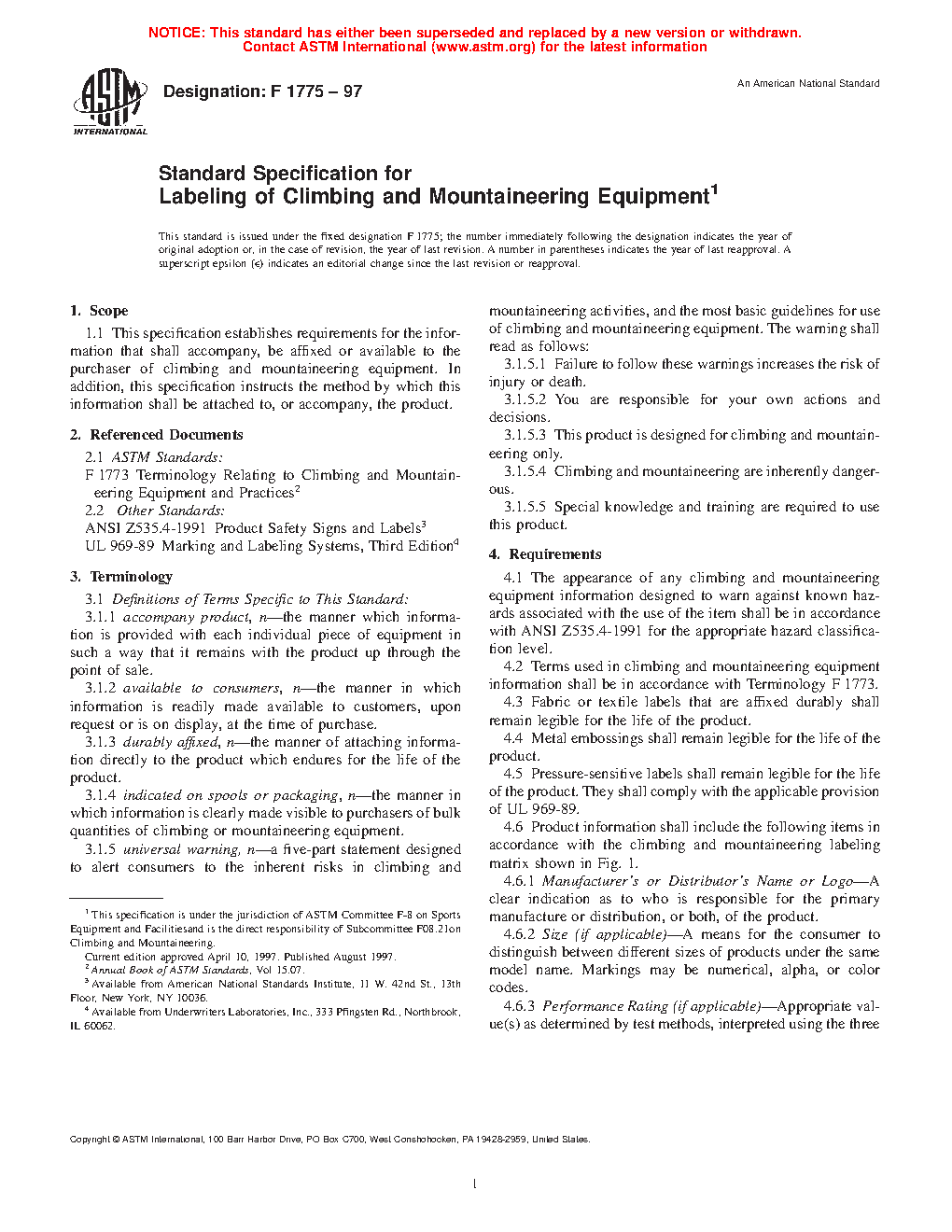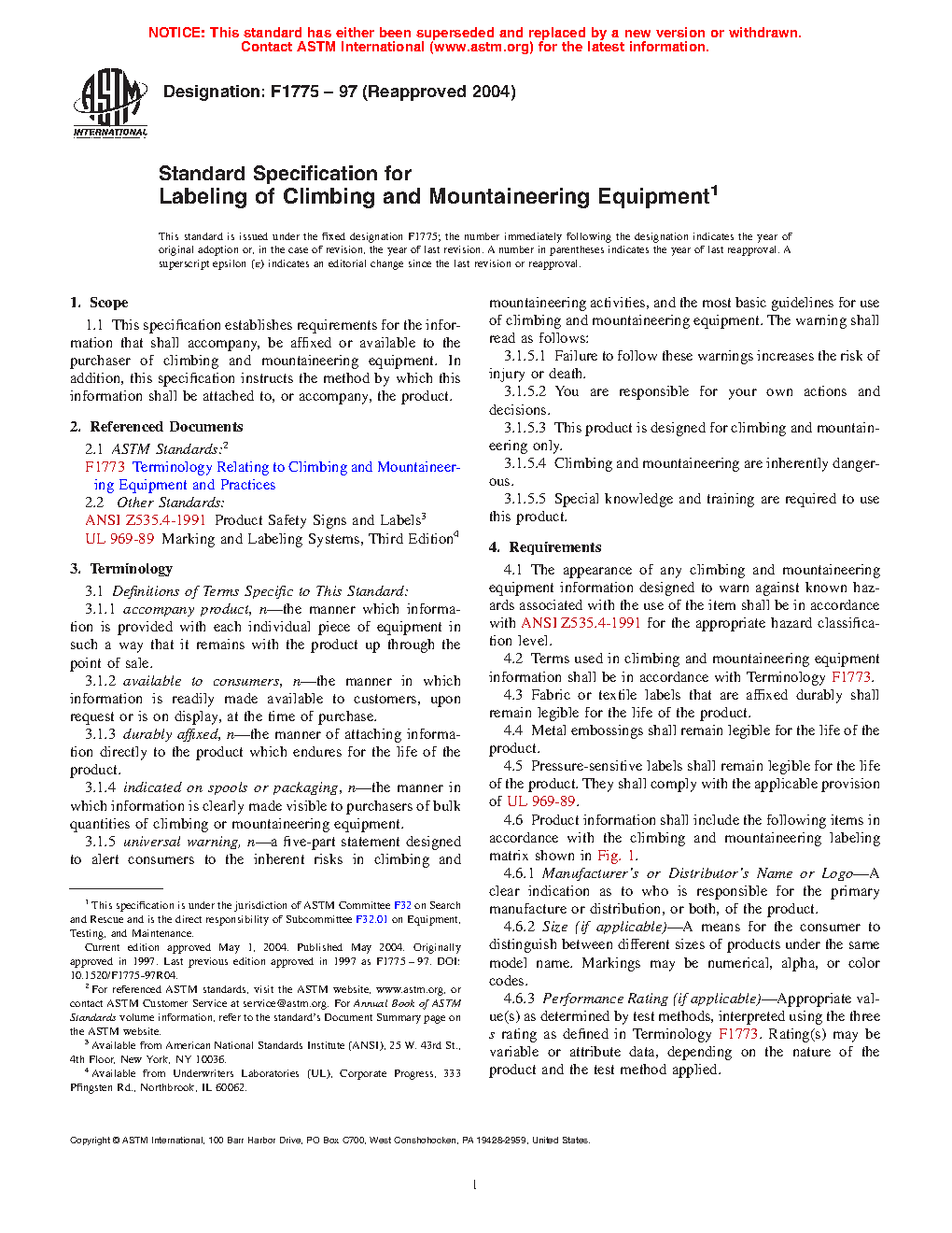 1.1 This specification establishes requirements for the information that shall accompany, be affixed or available to the purchaser of climbing and mountaineering equipment. In addition, this specification instructs the method by which this information shall be attached to, or accompany, the product.