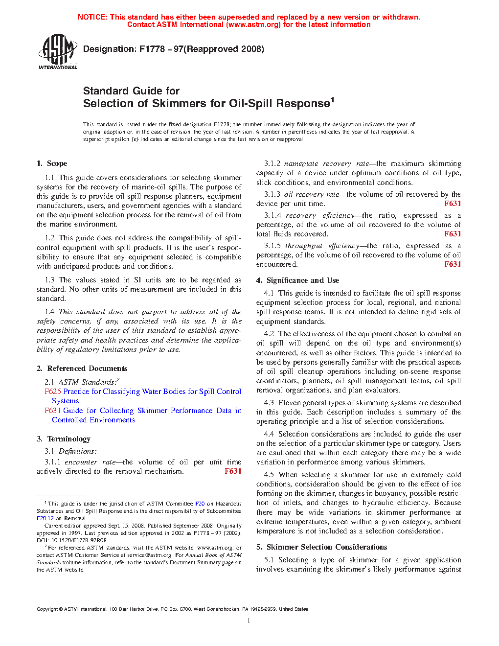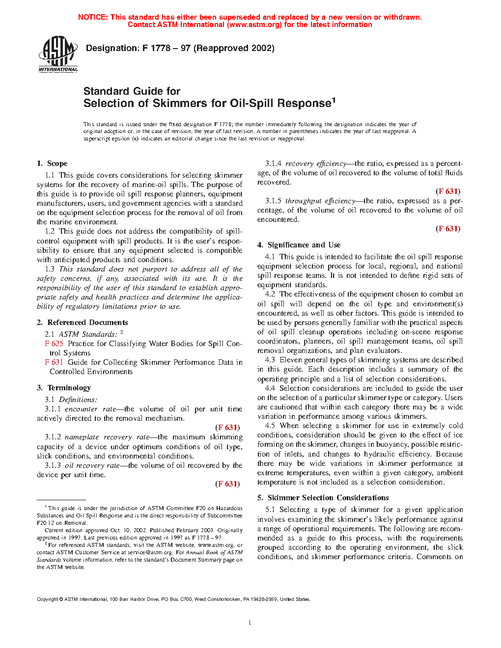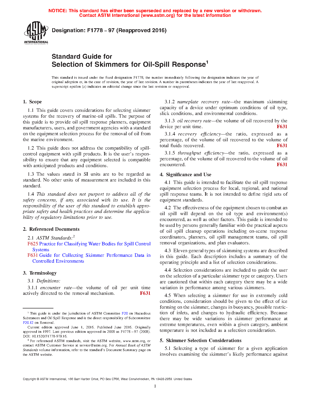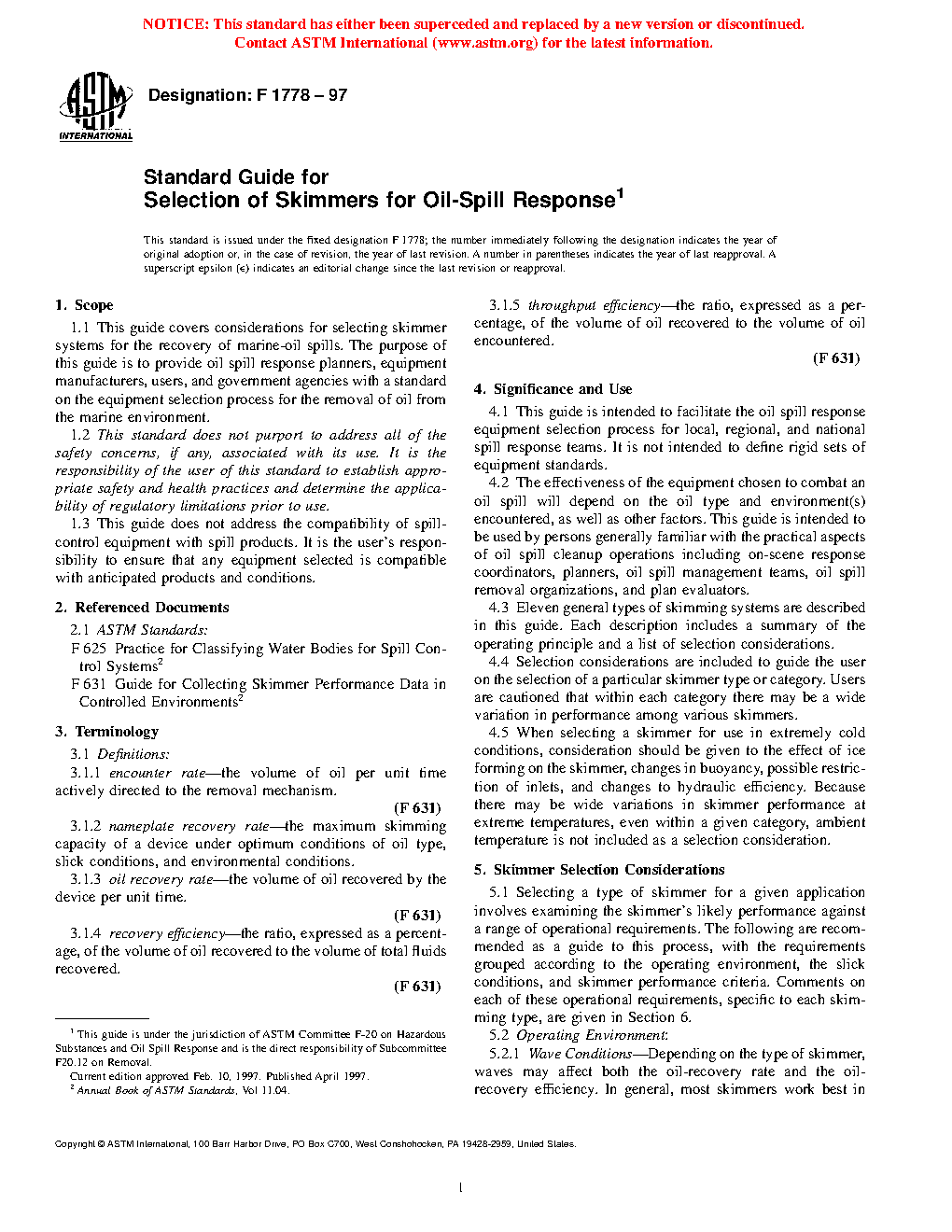 4.4 Selection considerations are included to guide the user on the selection of a particular skimmer type or category. Users are cautioned that within each category there may be a wide variation in performance among various skimmers.