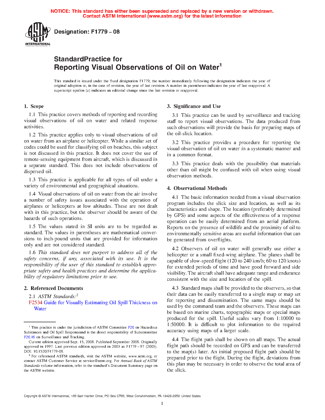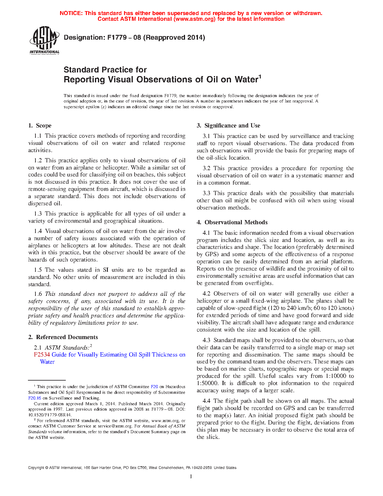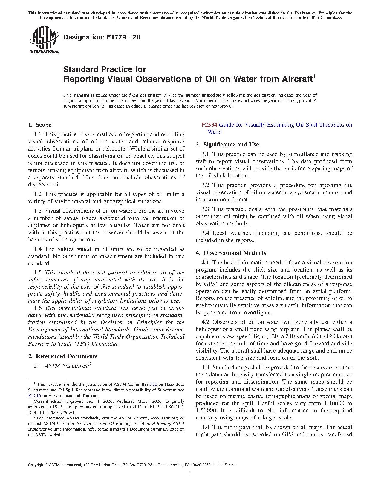 1.1 This practice covers methods of reporting and recording visual observations of oil on water and related response activities from an airplane or helicopter. While a similar set of codes could be used for classifying oil on beaches, this subject is not discussed in this practice. It does not cover the use of remote-sensing equipment from aircraft, which is discussed in a separate standard. This does not include observations of dispersed oil.