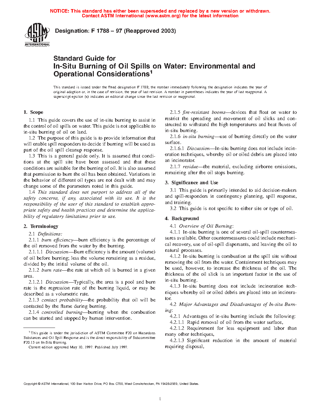 1.1 This guide covers the use of in-situ burning to assist in the control of oil spills on water. This guide is not applicable to in-situ burning of oil on land.