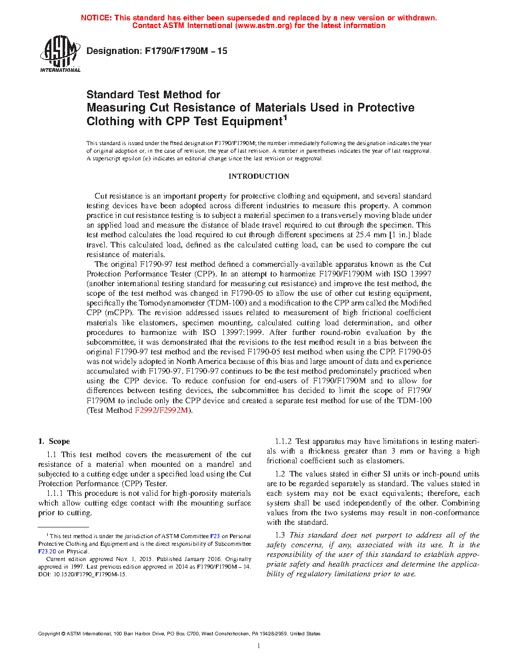 1.1 This test method covers the measurement of the cut resistance of a material when mounted on a mandrel and subjected to a cutting edge under a specified load using the Cut Protection Performance (CPP) Tester.