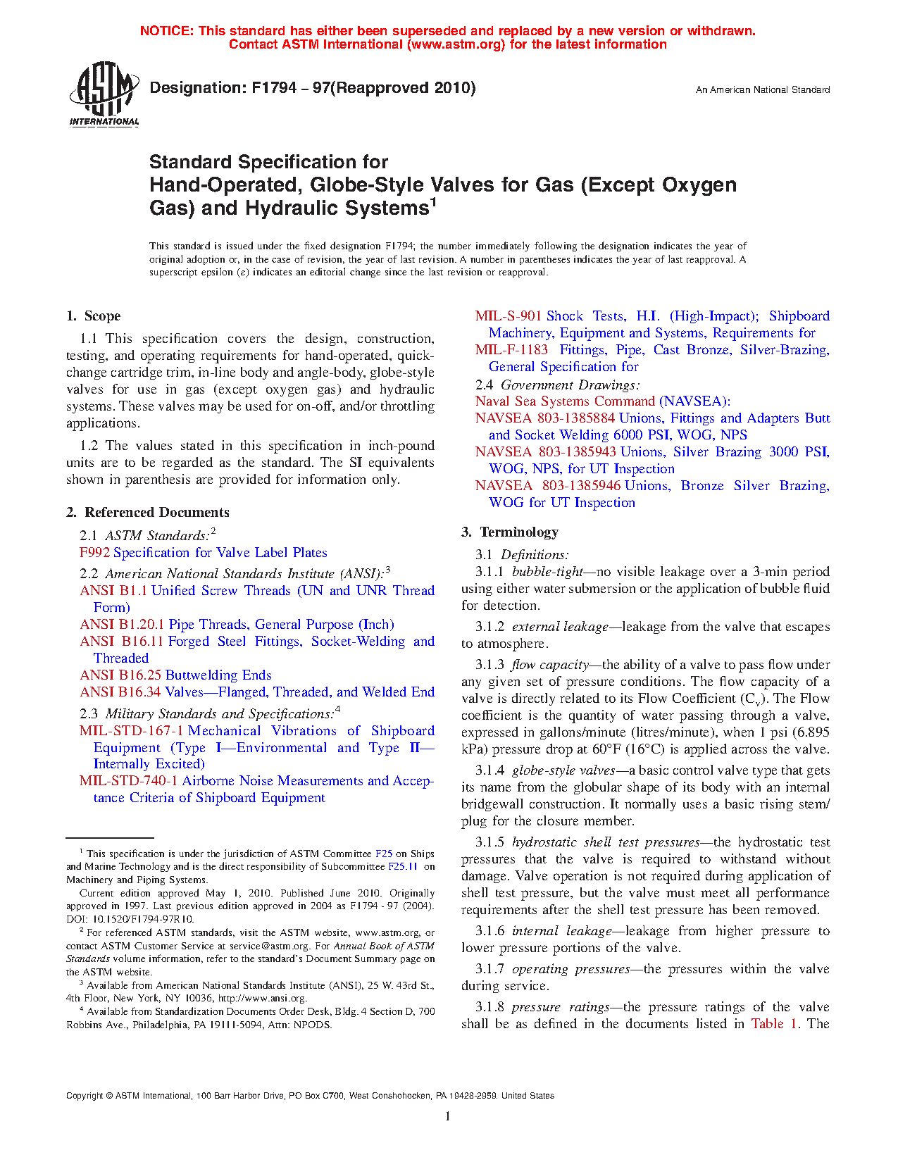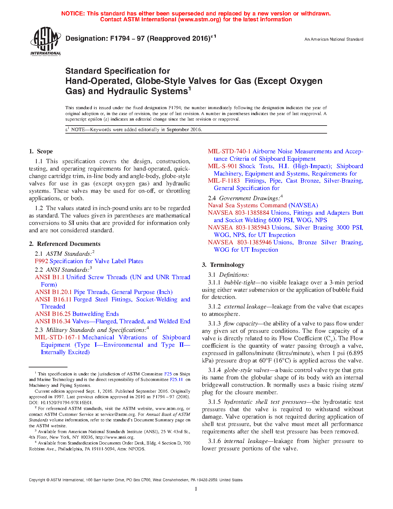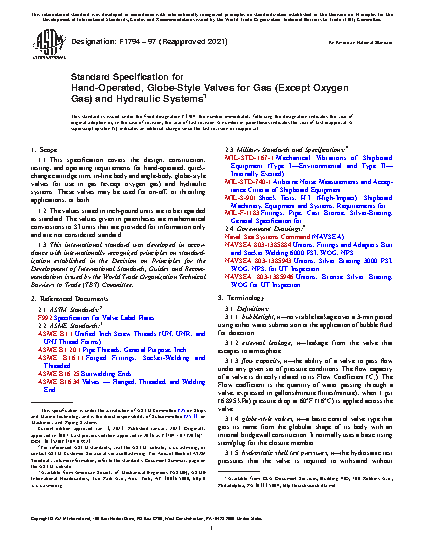 1.1 This specification covers the design, construction, testing, and operating requirements for hand-operated, quick-change cartridge trim, in-line body and angle-body, globe-style valves for use in gas (except oxygen gas) and hydraulic systems. These valves may be used for on-off, or throttling applications, or both.