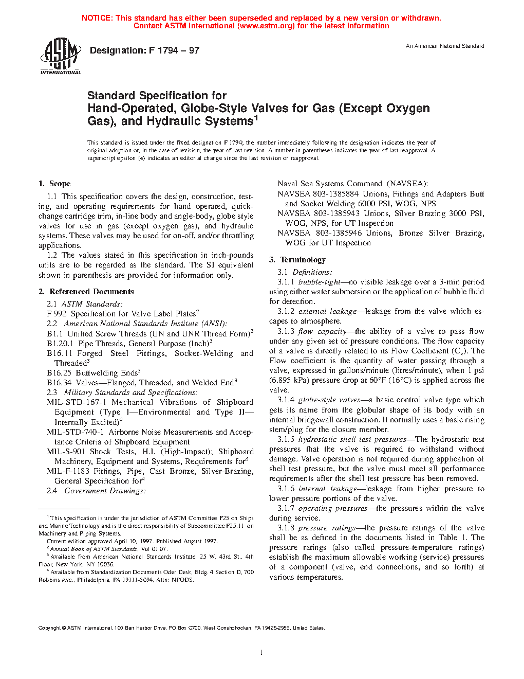This specification covers the design, construction, testing, and operating requirements for hand operated, quick-change cartridge trim, in-line body and angle-body, globe-style valves for use in gas (except oxygen gas) and hydraulic systems. These valves may be used for on-off, and/or throttling applications. Valves under this specification shall be Type I or Type II; Style I or Style II; and shall have the specified size, pressure rating, and end connections. Valves furnished under this specification shall be soft-seated, globe-style valves using a cartridge in which all working parts including the seat are removable as an assembly. The pressure containing envelope shall be made of corrosion-resistant steel, nickel-copper, nickel-aluminum-bronze, or bronze. Internal parts in contact with the line media shall be made of corrosion-resistant steel, nickel-copper, copper-nickel, bronze, nickel-aluminum bronze, or naval brass. Valve construction requirements for the following are detailed: (1) soft-seating insert, (2) pressure envelope, (3) threads, (4) accessibility, (5) nonmetallic element interchangeability, (6) maintainability, (7) reversibility, (8) adjustments, (9) bidirectional operation and bubbletight shut off, (10) guiding, (11) valve operating force, (12) pressurizing rate, (13) operation, and (14) envelope dimensions. Valves shall meet the performance requirements of flow capacity, seat tightness, and external leakage. Each valve shall pass the following tests: visual examination, hydrostatic shell test, seat tightness test, and external leakage test. The envelope dimensions for angle body and inline body construction are illustrated.
