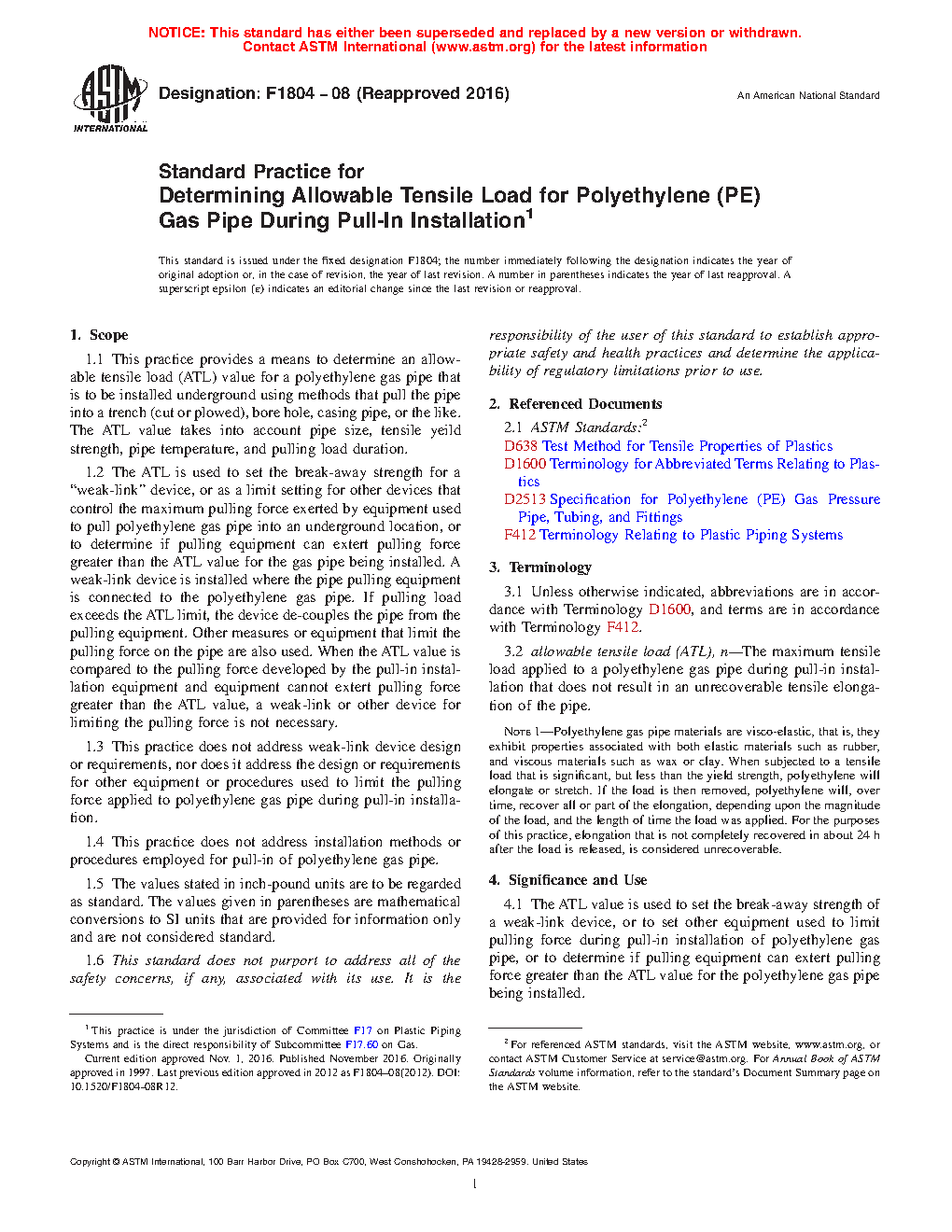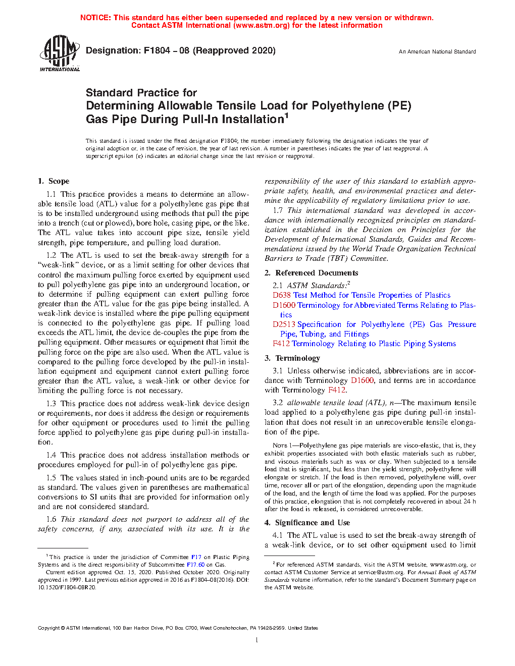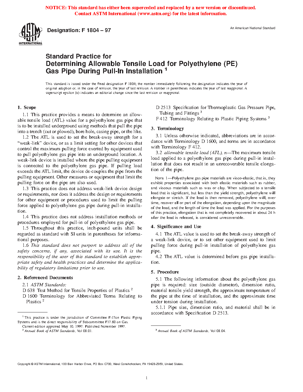 1.4 This practice does not address installation methods or procedures employed for pull-in of polyethylene gas pipe. The appropriate design (safety) factor for calculation of the ATL) is indicated in “Note 3”.