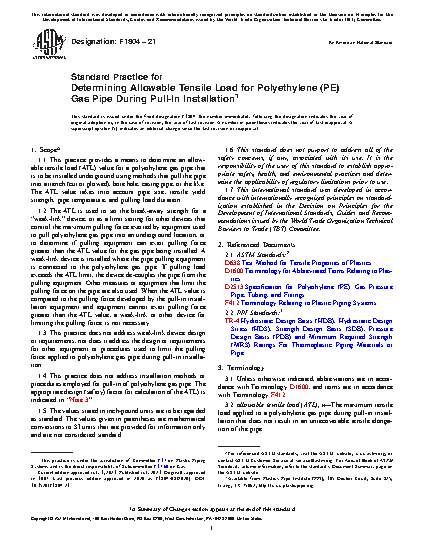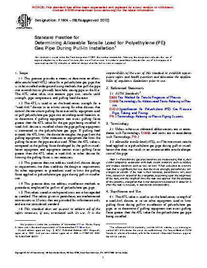 1.1 This practice provides a means to determine an allowable tensile load (ATL) value for a polyethylene gas pipe that is to be installed underground using methods that pull the pipe into a trench (cut or plowed), bore hole, casing pipe, or the like. The ATL value takes into account pipe size, tensile yield strength, pipe temperature, and pulling load duration.