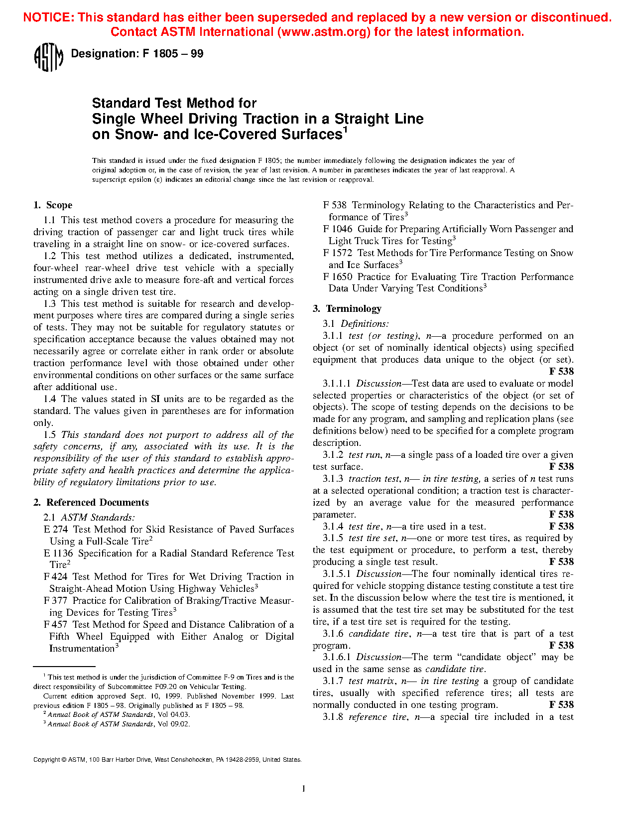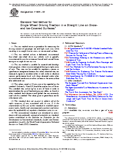 5.3 This test method addresses longitudinal driving traction properties only on snow and ice surfaces. Refer to Test Methods F1572 for test methods for braking and lateral traction properties on snow or ice, or both.