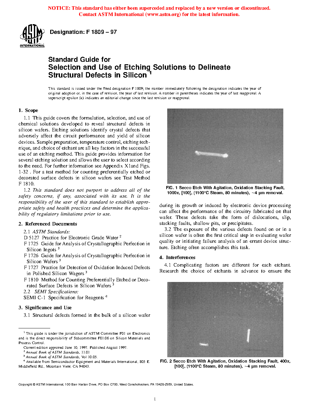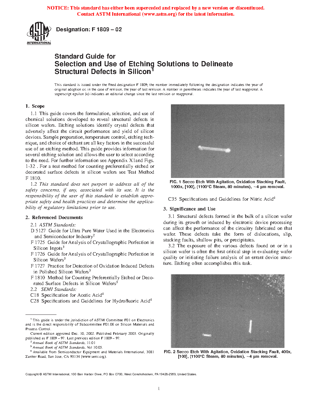 1.1 This guide covers the formulation, selection, and use of chemical solutions developed to reveal structural defects in silicon wafers. Etching solutions identify crystal defects that adversely affect the circuit performance and yield of silicon devices. Sample preparation, temperature control, etching technique, and choice of etchant are all key factors in the successful use of an etching method. This guide provides information for several etching solutions and allows the user to select according to the need. For further information see Appendix X1 and Figs. 1-32. For a test method for counting preferentially etched or decorated surface defects in silicon wafers see Test Method F 1810.