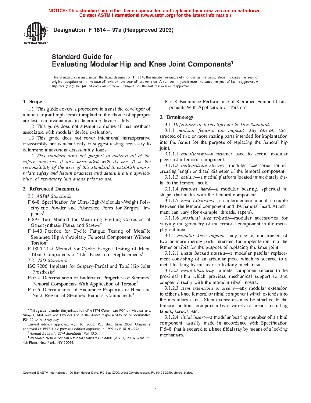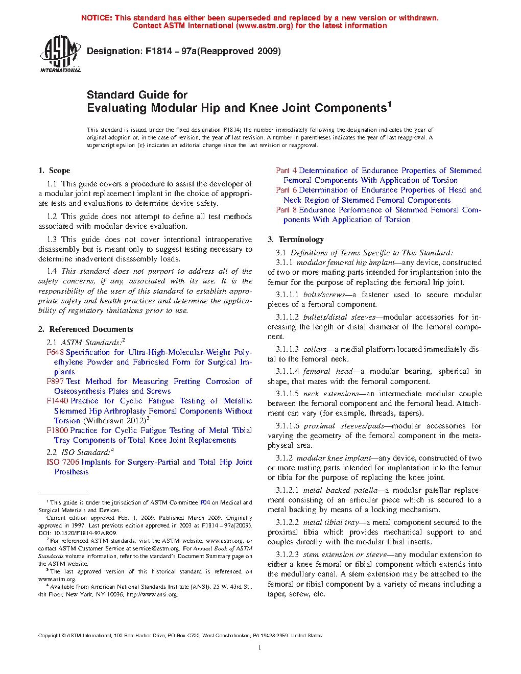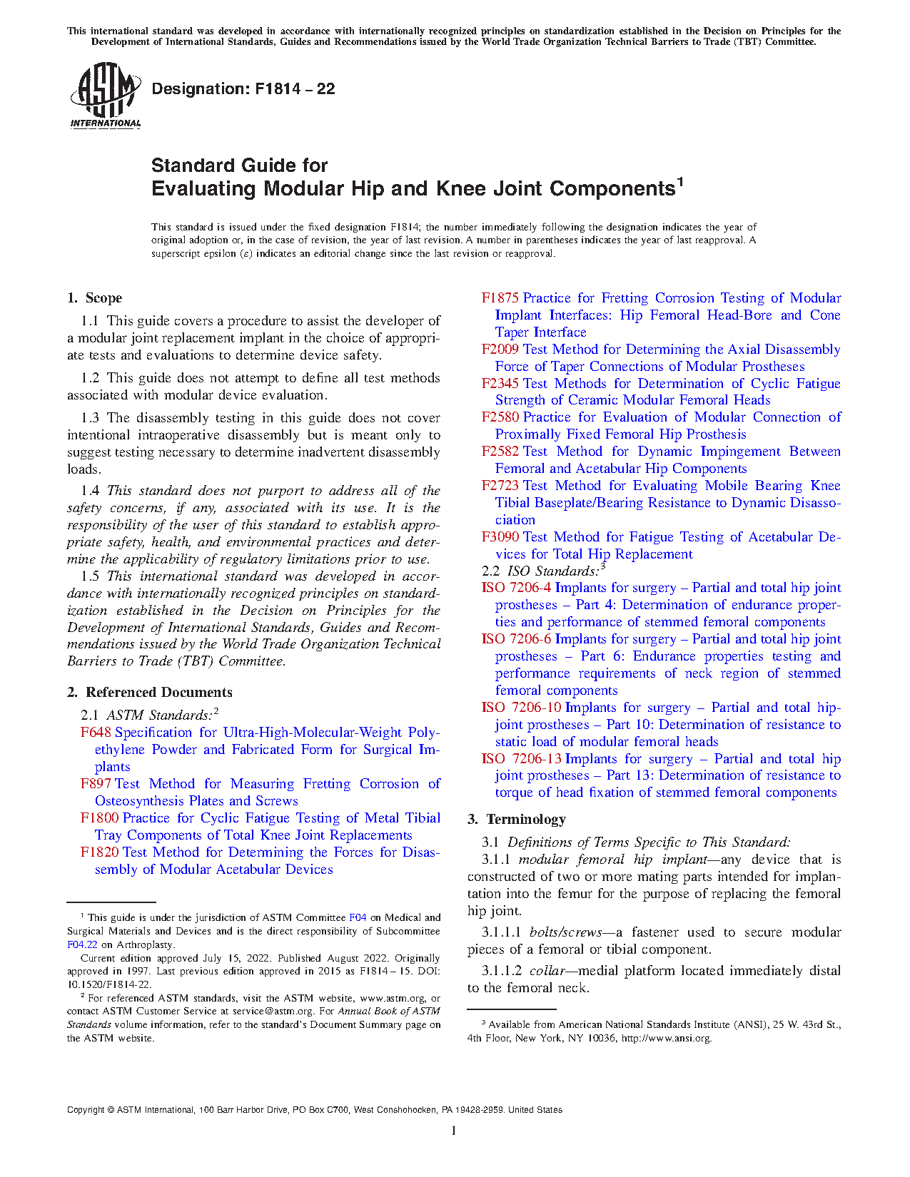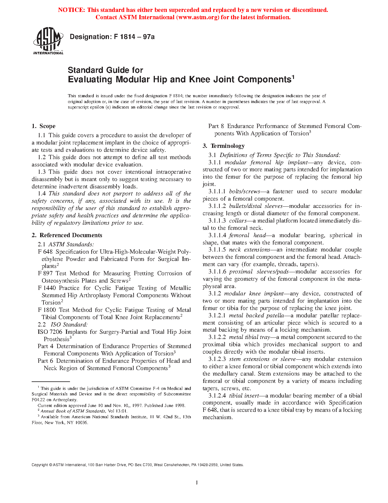 4.1 The tests suggested within this guide cover many different, but not all possible, areas of research and concern with regard to modular hip stems and modular knee components.