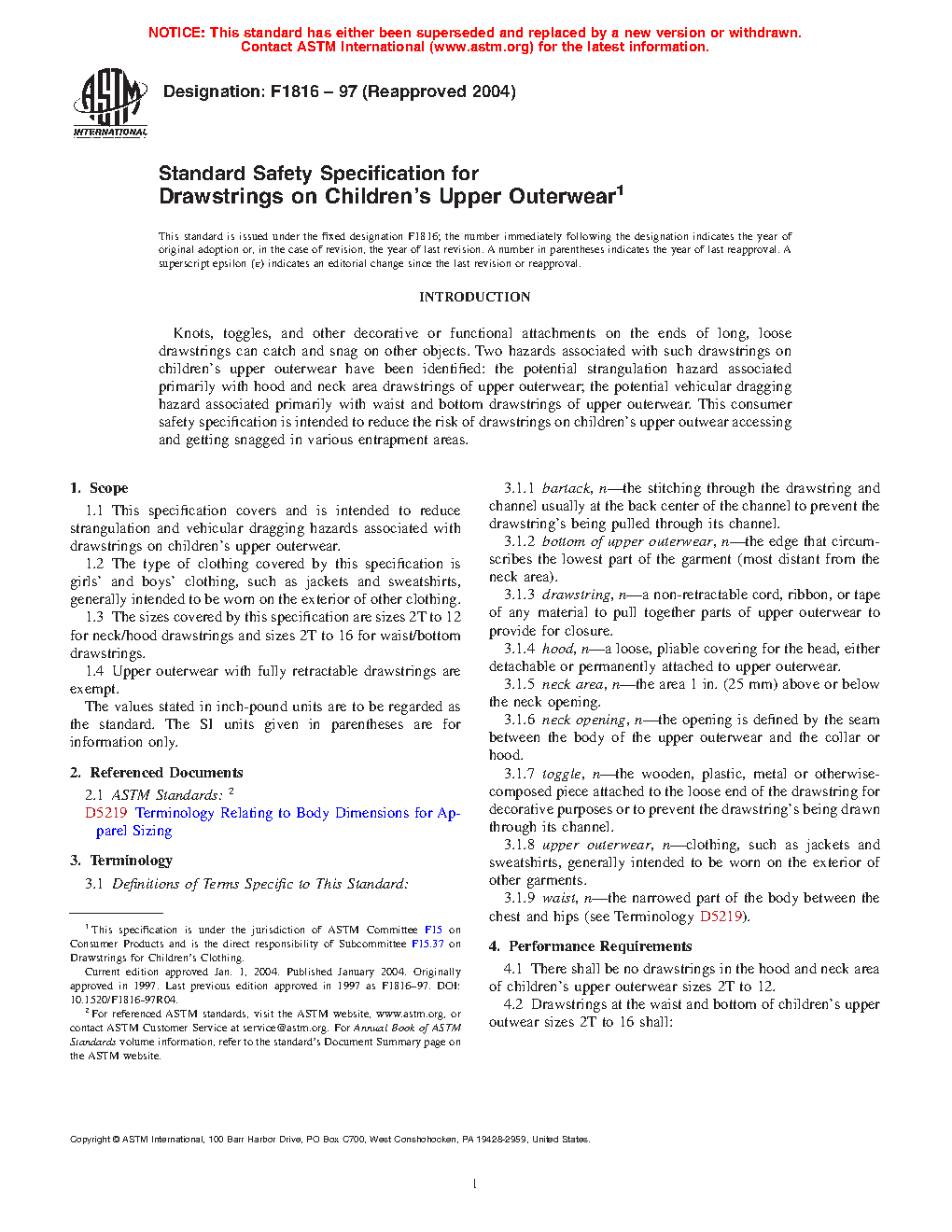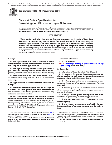 1.1 This specification covers and is intended to reduce strangulation and vehicular dragging hazards associated with drawstrings on children's upper outerwear.