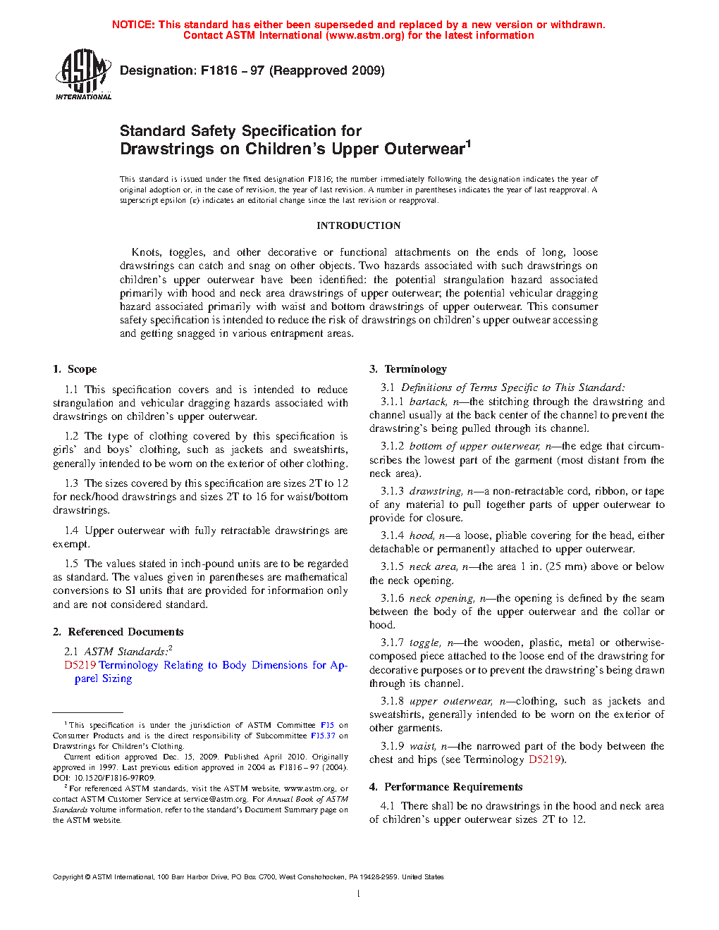 1.1 This specification covers and is intended to reduce strangulation and vehicular dragging hazards associated with drawstrings on children's upper outerwear.