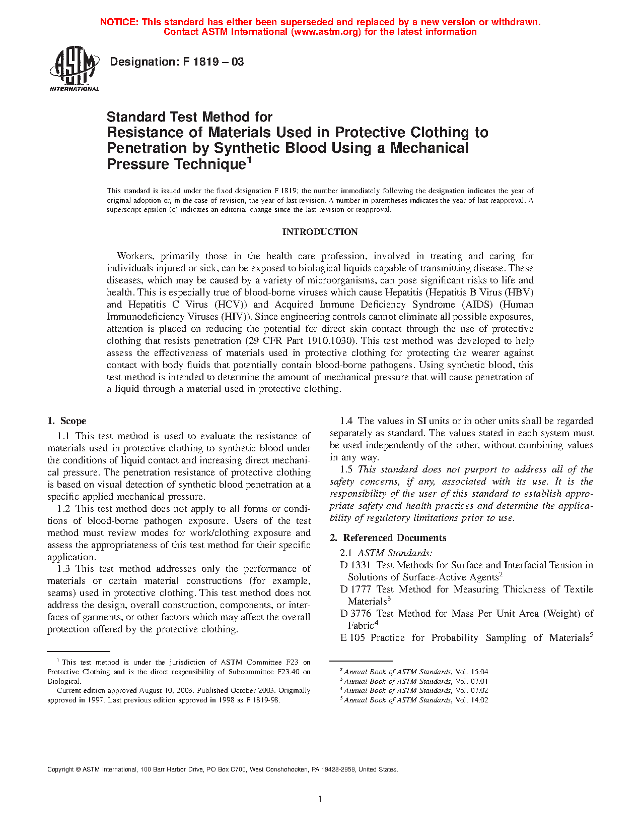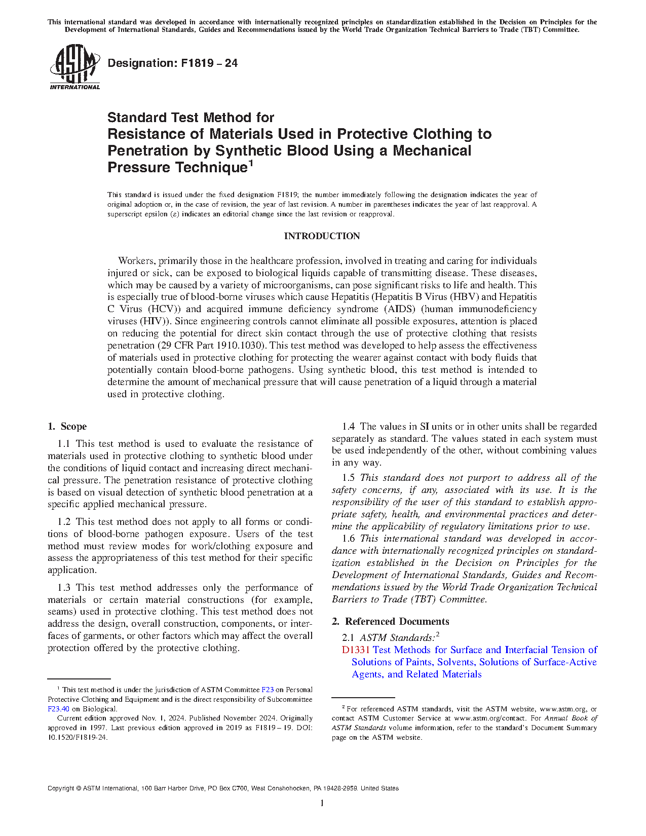 5.8 It is known that body fluids penetrating protective clothing materials are likely to carry microbiological contaminants; however, visual detection methods are not sensitive enough to detect minute amounts of liquid containing microorganisms (4,5,6). No viral resistance claims can be made based on this test method as materials can pass this test method and fail Test Method F1671.
