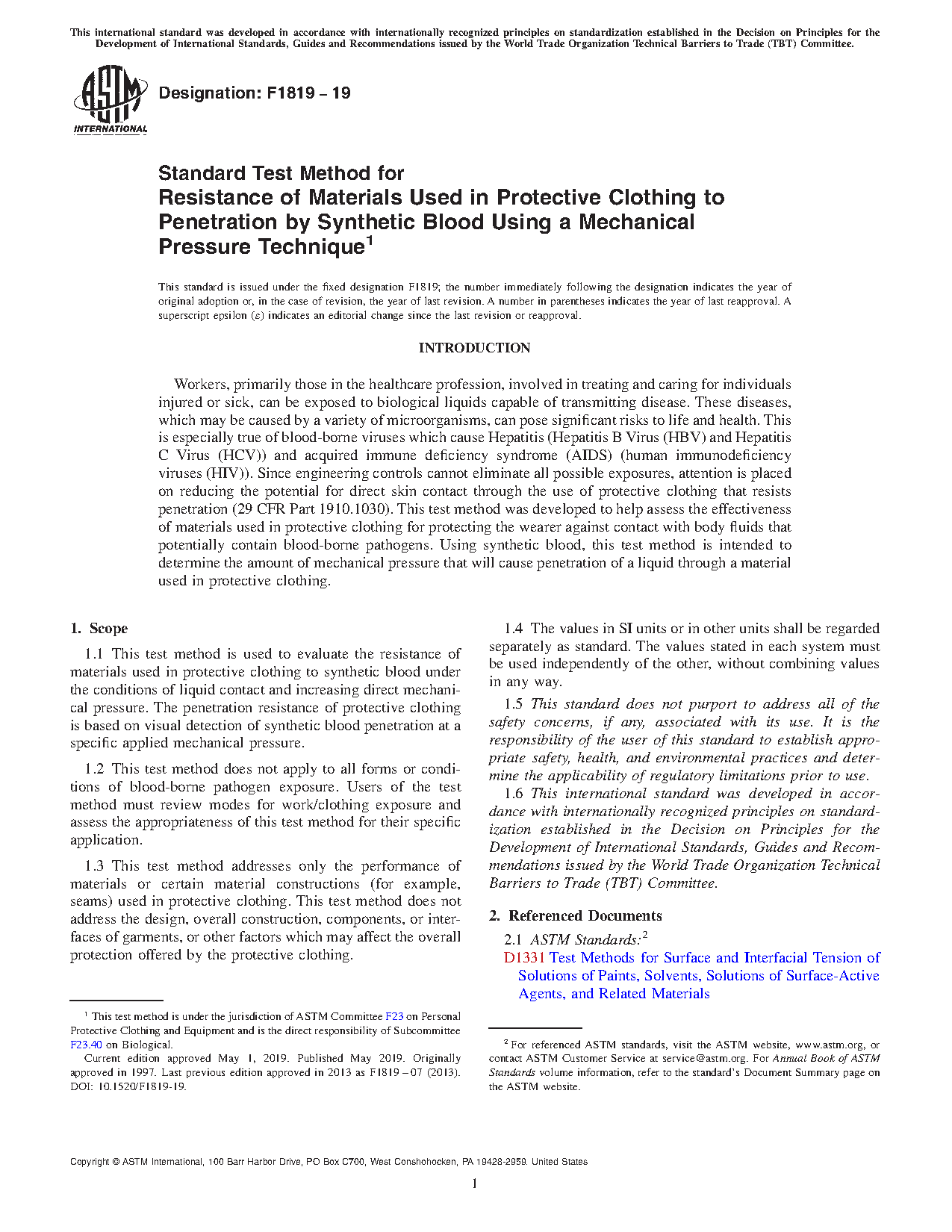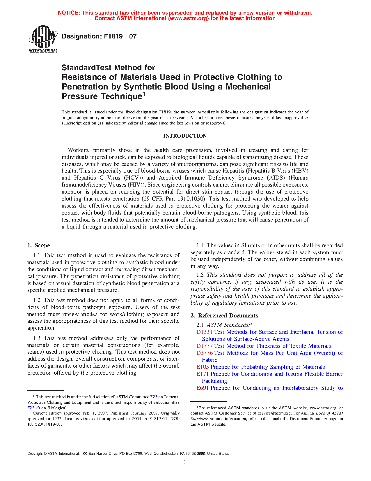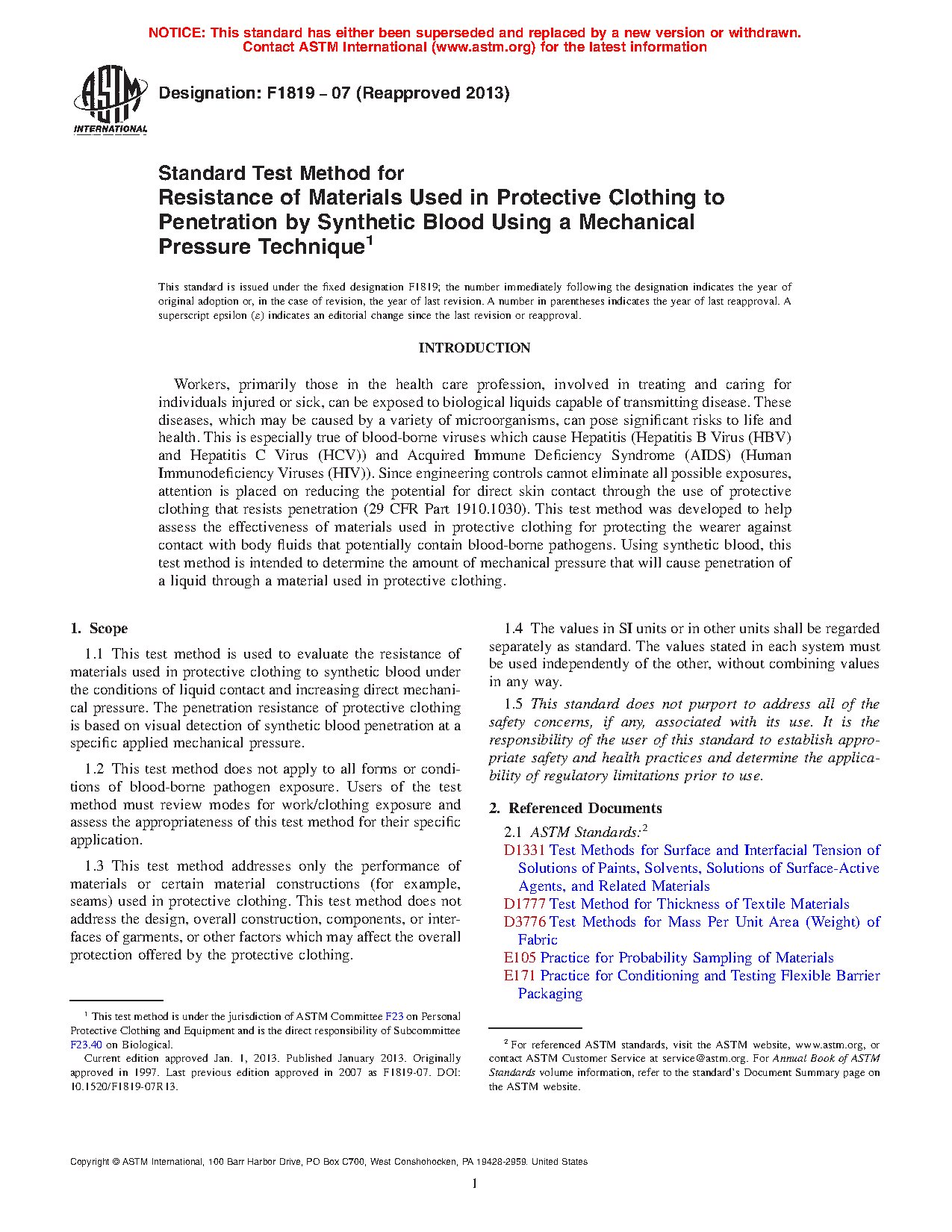 1.2 This test method does not apply to all forms or conditions of blood-borne pathogen exposure. Users of the test method must review modes for work/clothing exposure and assess the appropriateness of this test method for their specific application
