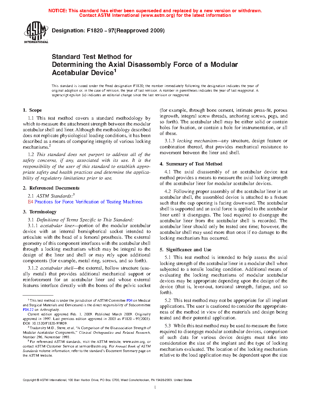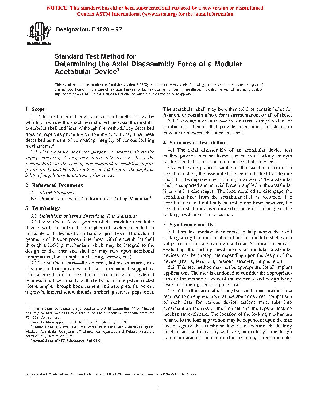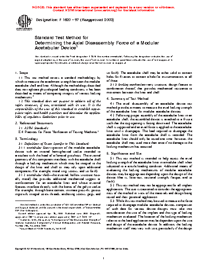 1.1 This test method covers a standard methodology by which to measure the attachment strength between the modular acetabular shell and liner. Although the methodology described does not replicate physiological loading conditions, it has been described as a means of comparing the integrity of various locking mechanisms.
