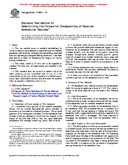 5.3 While these test methods may be used to measure the force required to disengage modular acetabular devices, comparison of such data for various device designs must take into consideration the size of the implant and the type of locking mechanism evaluated. The location of the locking mechanism relative to the load application may be dependent upon the size and design of the acetabular device. In addition, the locking mechanism itself may vary with size, particularly if the design is circumferential in nature (for example, a larger diameter implants would have a greater area of acetabular shell/acetabular liner interface than a small diameter implant).
