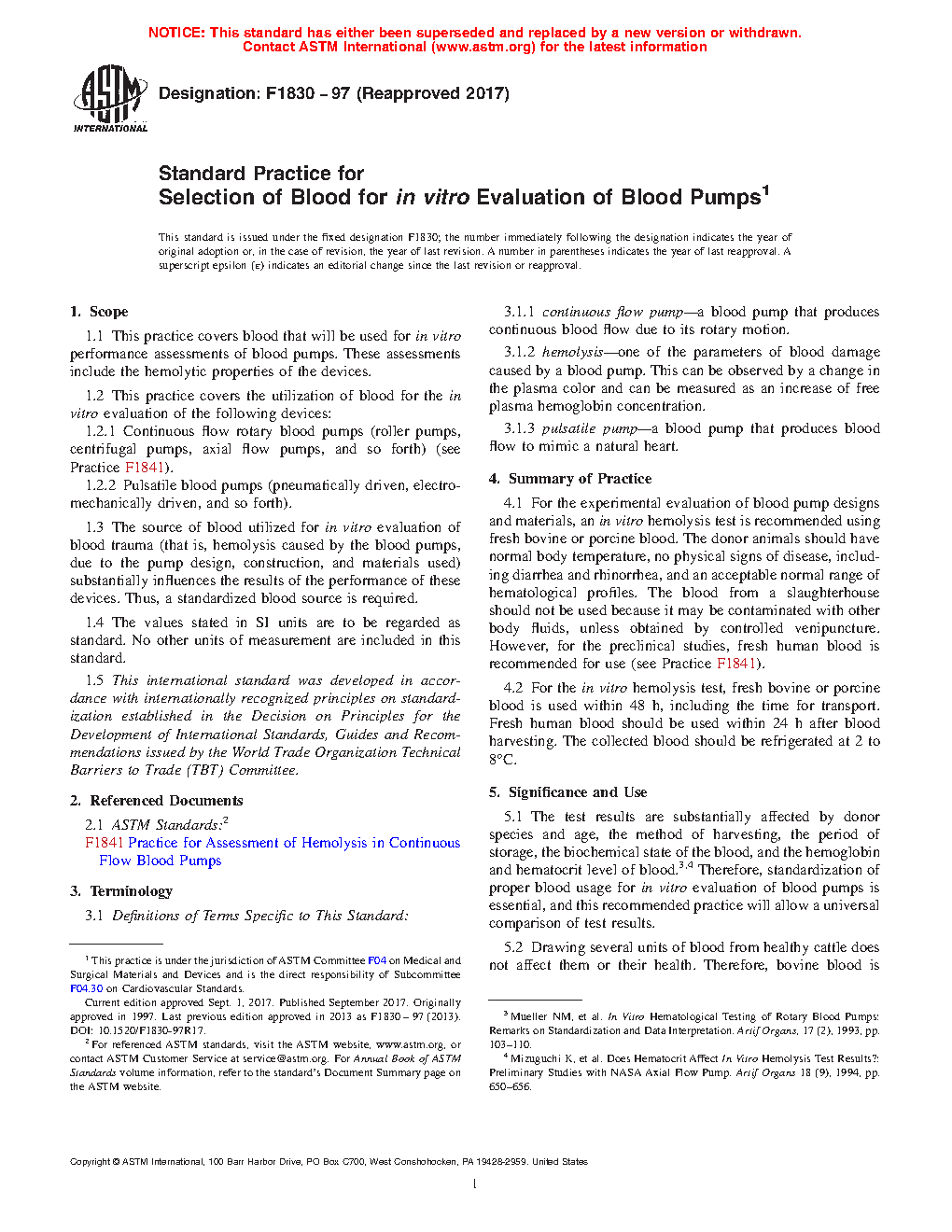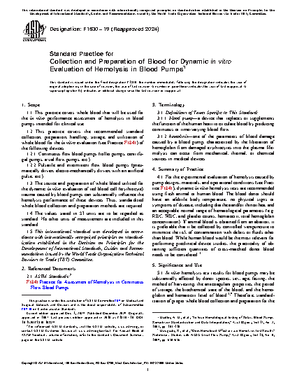 1.1 This practice covers whole blood that will be used for the in vitro performance assessment of hemolysis in blood pumps intended for clinical use.