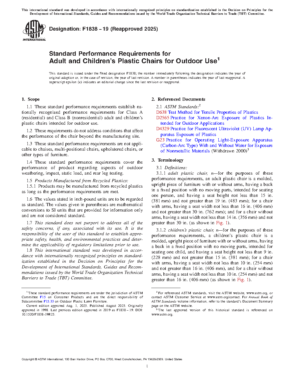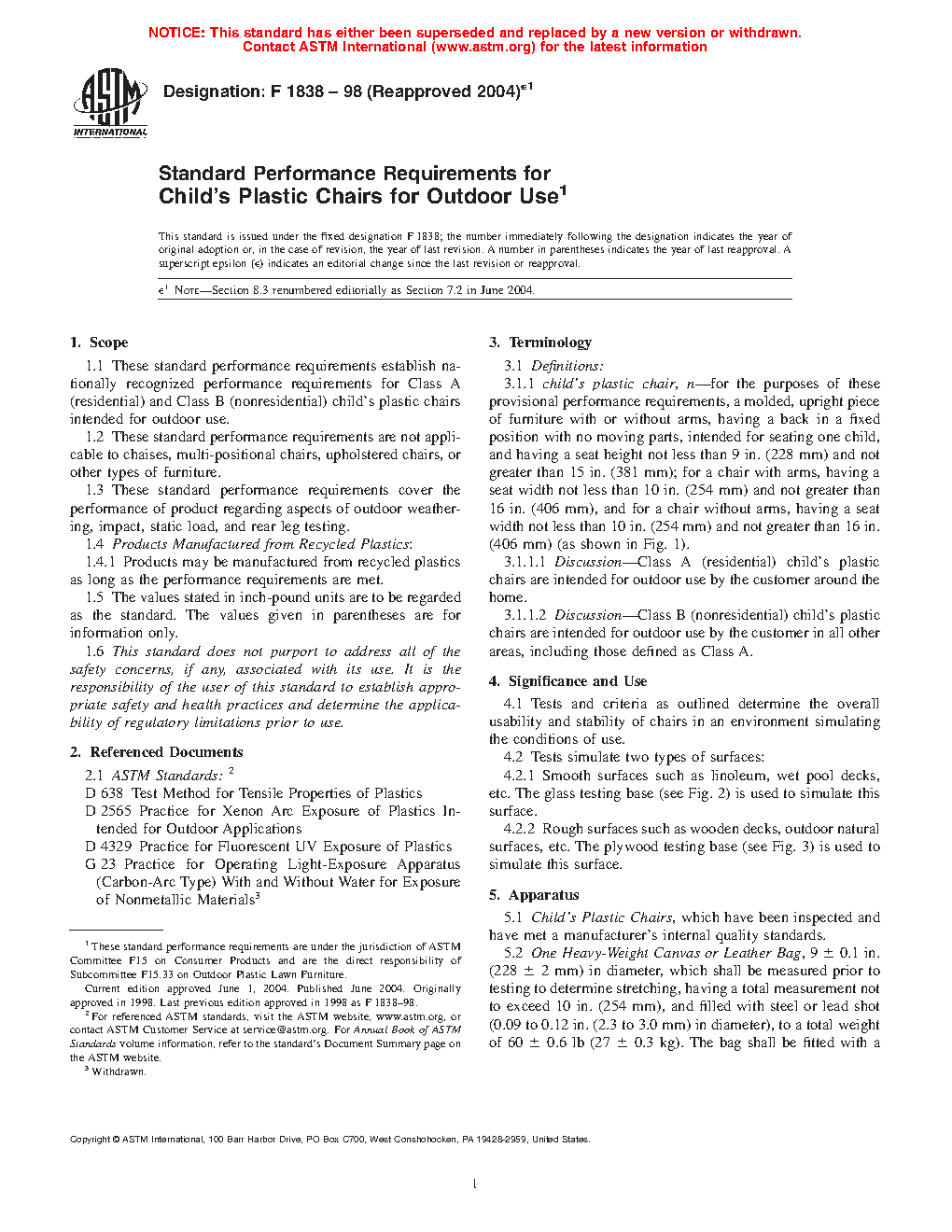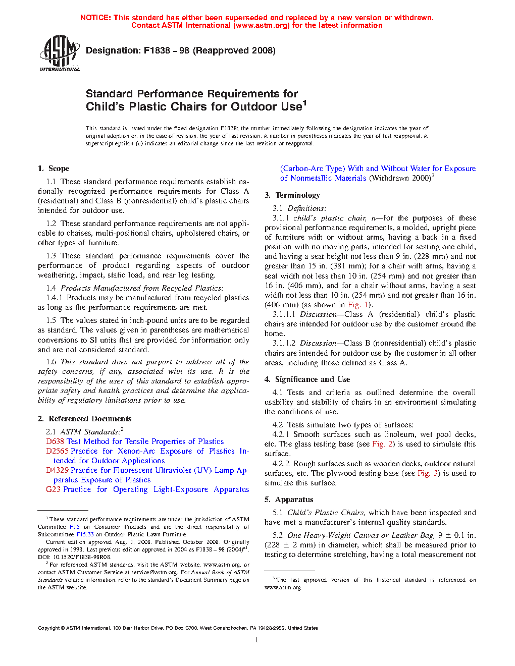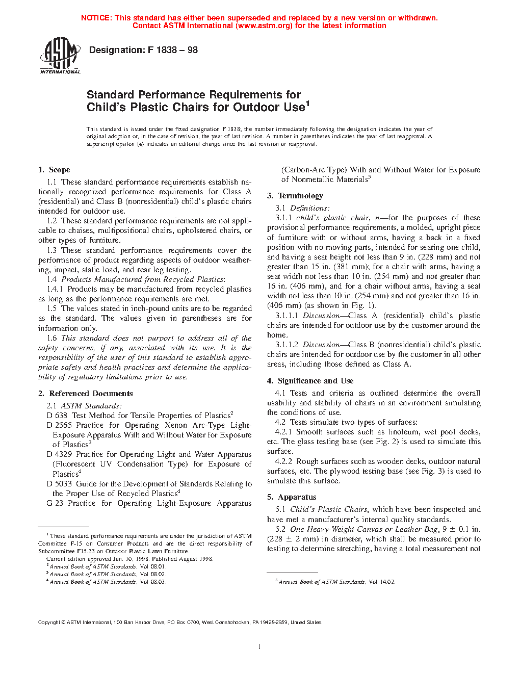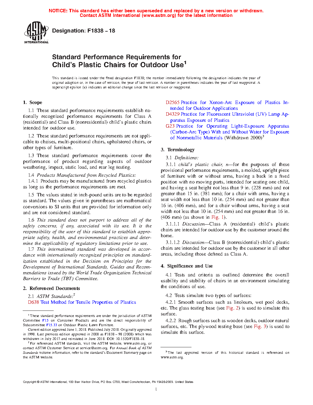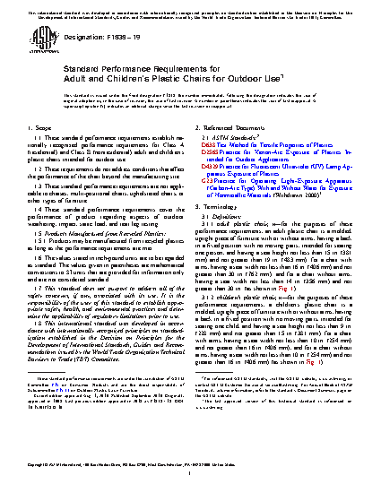 1.1 These standard performance requirements establish nationally recognized performance requirements for Class A (residential) and Class B (nonresidential) adult and children’s plastic chairs intended for outdoor use.