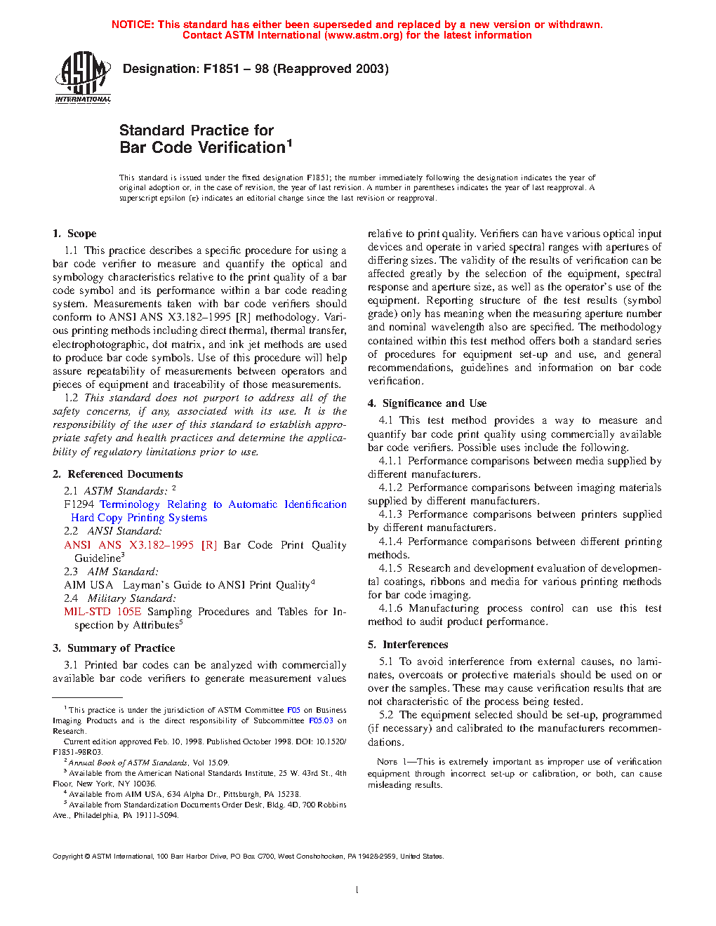 1.1 This practice describes a specific procedure for using a bar code verifier to measure and quantify the optical and symbology characteristics relative to the print quality of a bar code symbol and its performance within a bar code reading system. Measurements taken with bar code verifiers should conform to ANSI ANS X3.182–1995 [R] methodology. Various printing methods including direct thermal, thermal transfer, electrophotographic, dot matrix, and ink jet methods are used to produce bar code symbols. Use of this procedure will help assure repeatability of measurements between operators and pieces of equipment and traceability of those measurements.