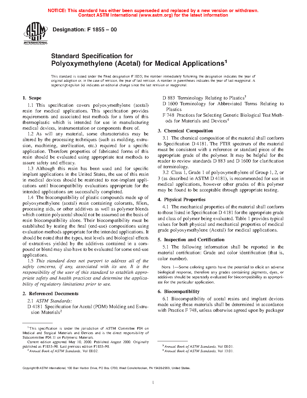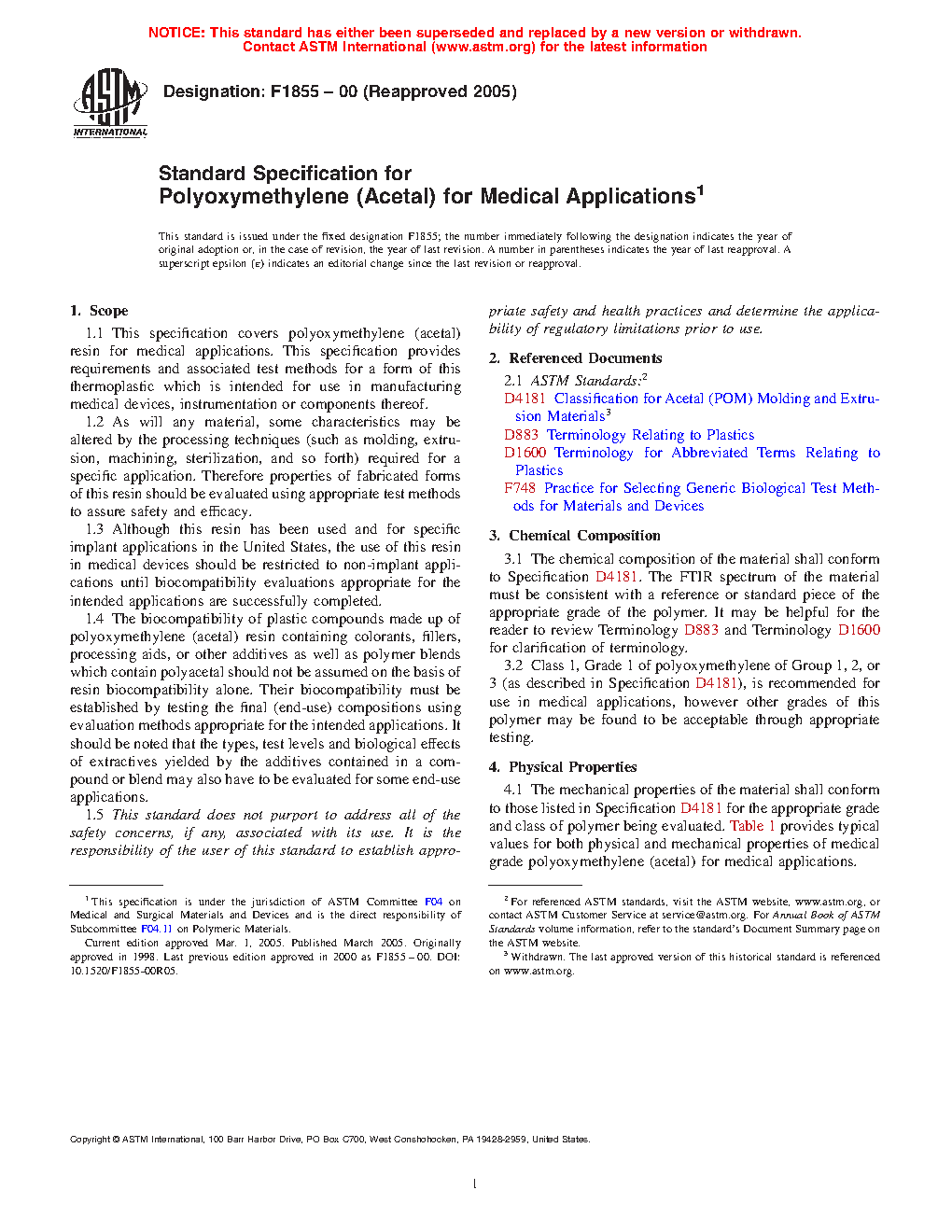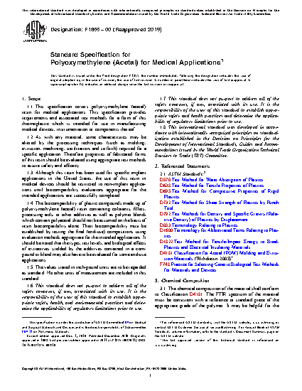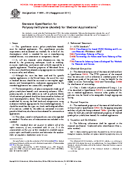 1.1 This specification covers polyoxymethylene (acetal) resin for medical applications. This specification provides requirements and associated test methods for a form of this thermoplastic which is intended for use in manufacturing medical devices, instrumentation or components thereof.