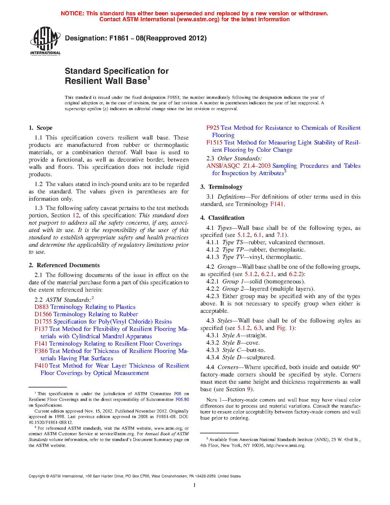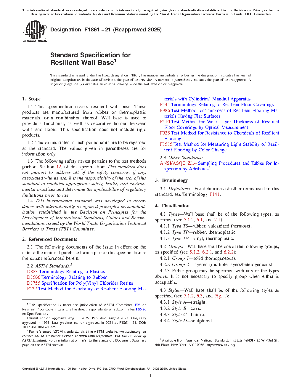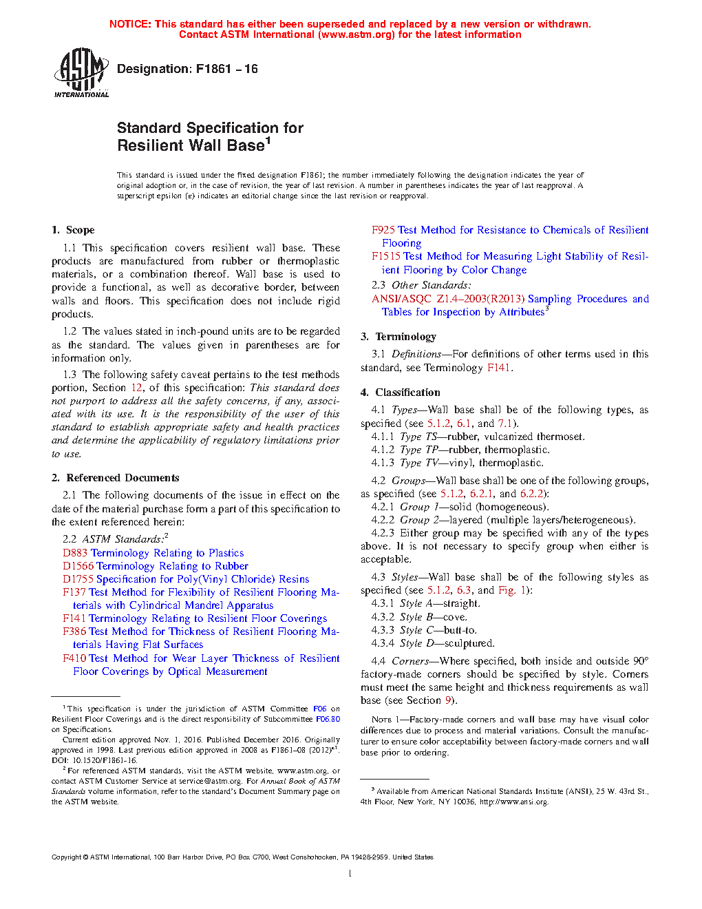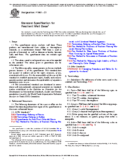1.1 This specification covers resilient wall base. These products are manufactured from rubber or thermoplastic materials, or a combination thereof. Wall base is used to provide a functional, as well as decorative border, between walls and floors. This specification does not include rigid products.