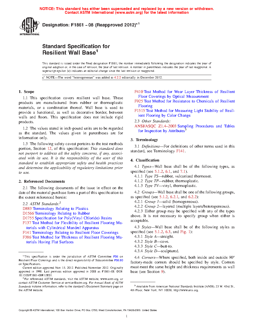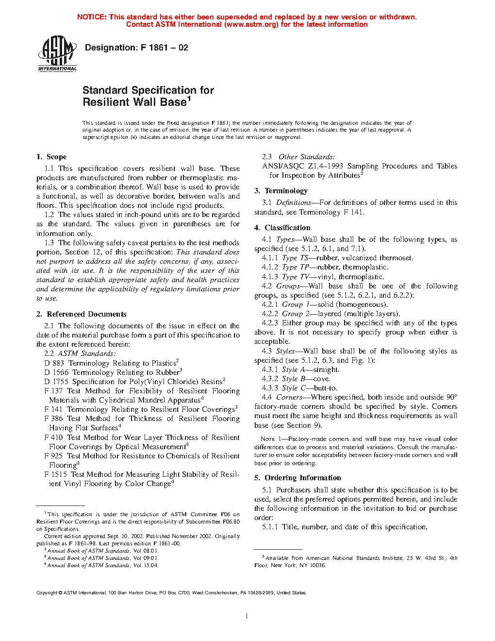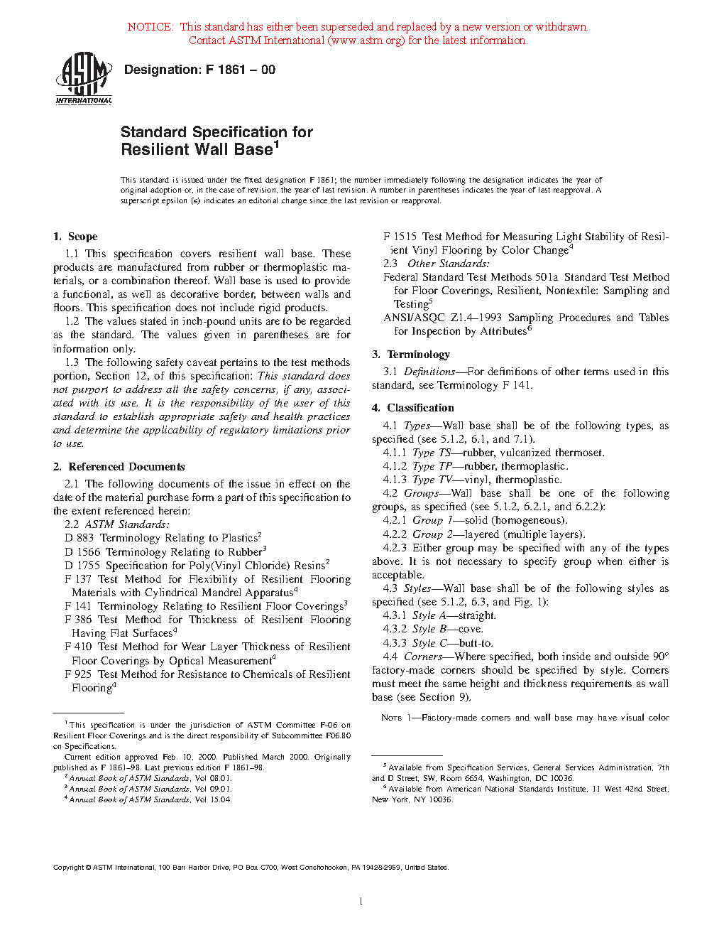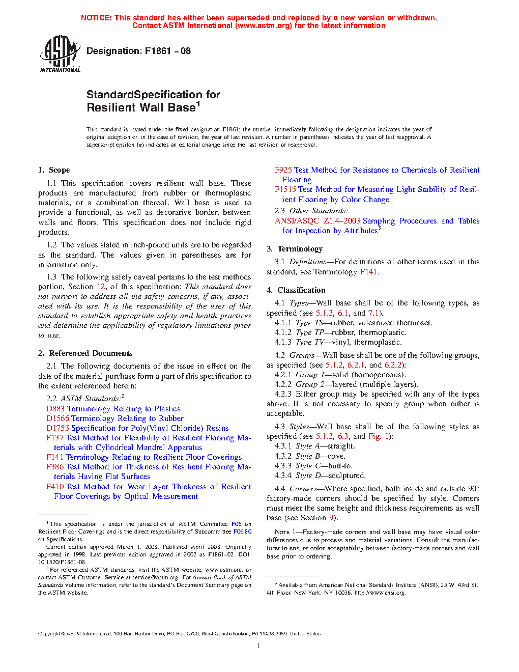 1.1 This specification covers resilient wall base. These products are manufactured from rubber or thermoplastic materials, or a combination thereof. Wall base is used to provide a functional, as well as decorative border, between walls and floors. This specification does not include rigid products.