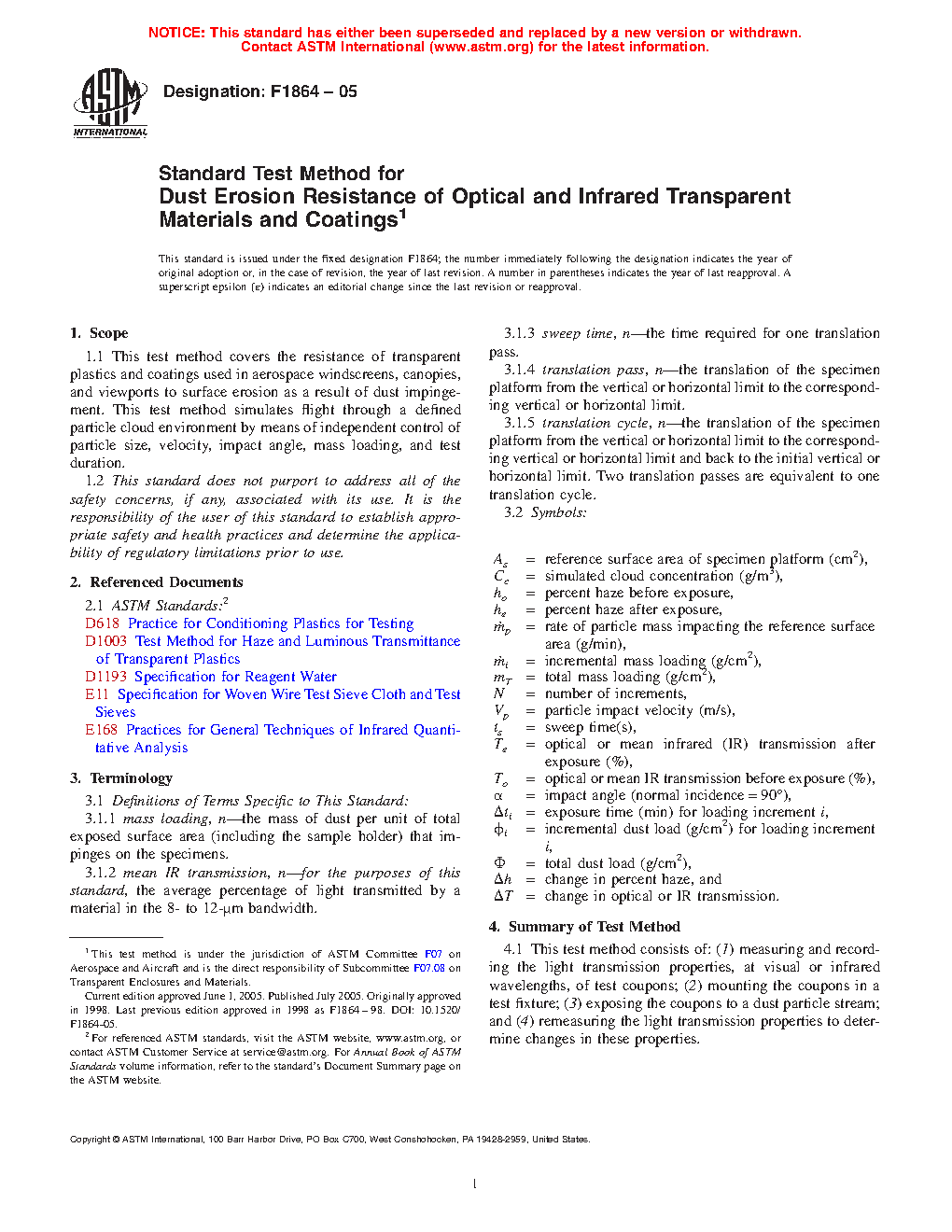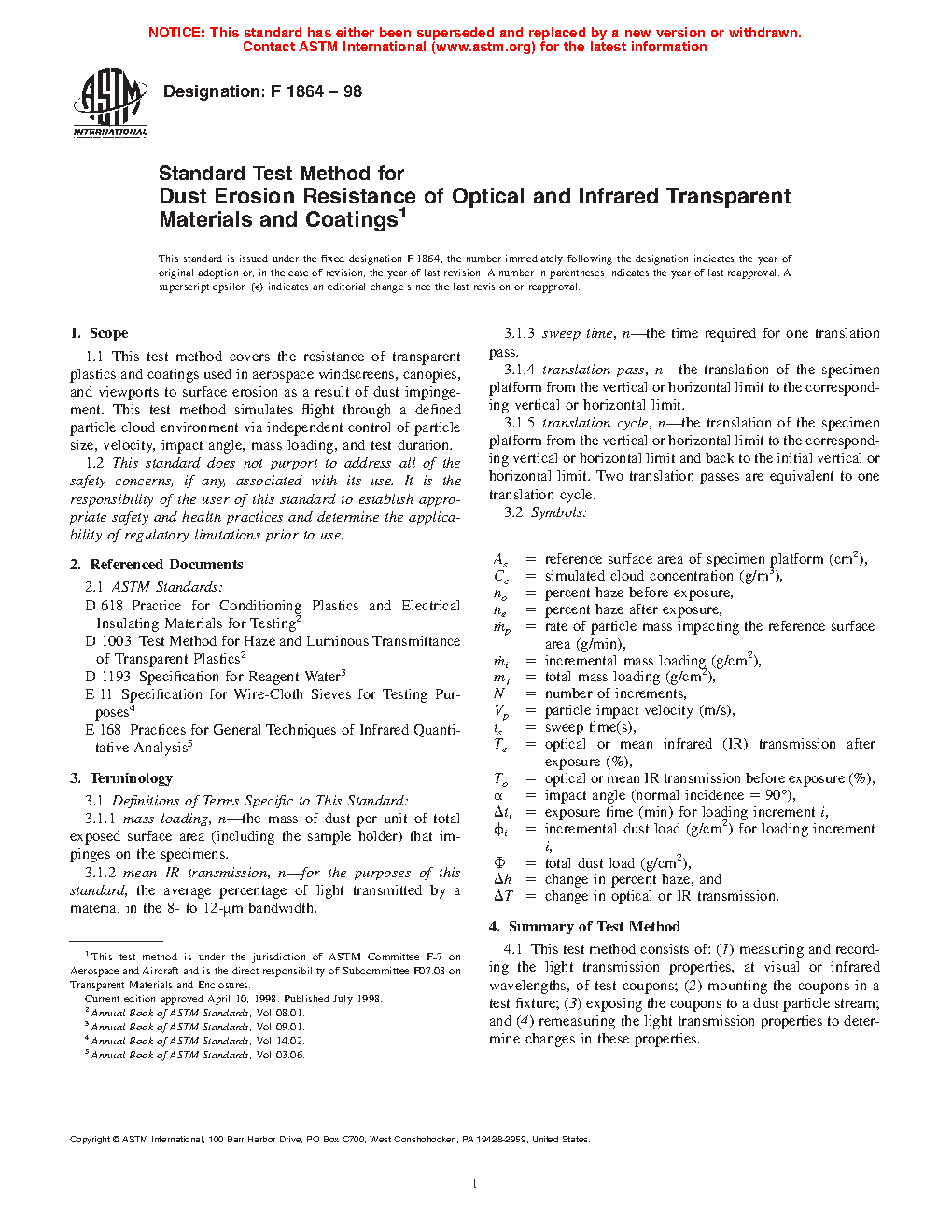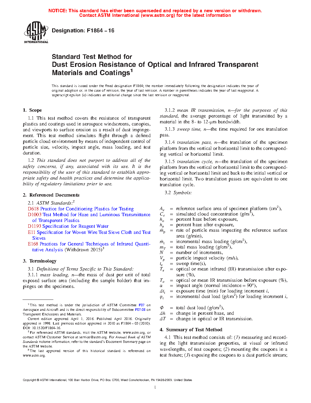 5.2 This test method is intended to provide a calibrated and repeatable means of determining the relative abrasion resistance of materials and coatings for optical and IR transparent materials and coatings. The test parameters for this test method can be directly related to dust cloud densities and velocities to which transparent materials are exposed in the field.