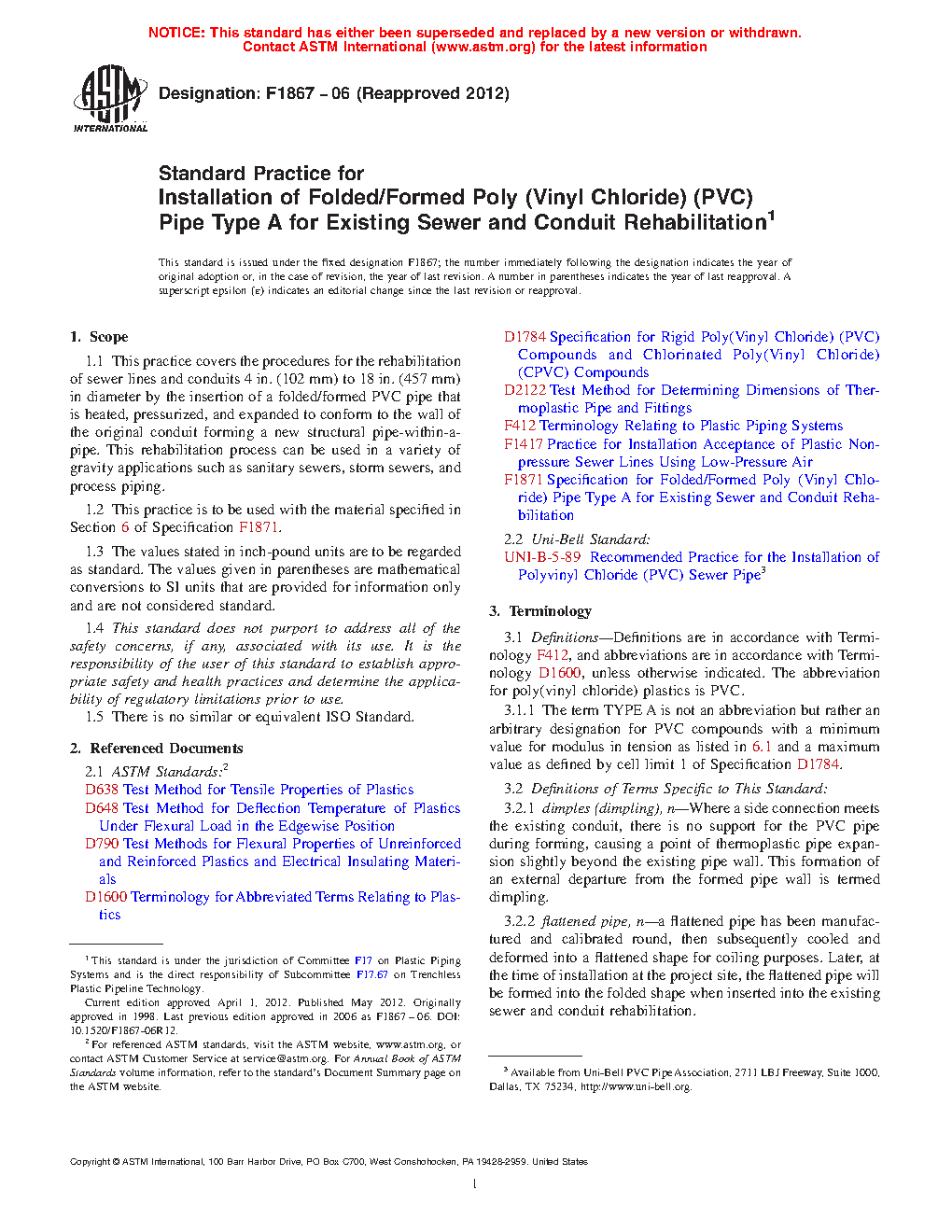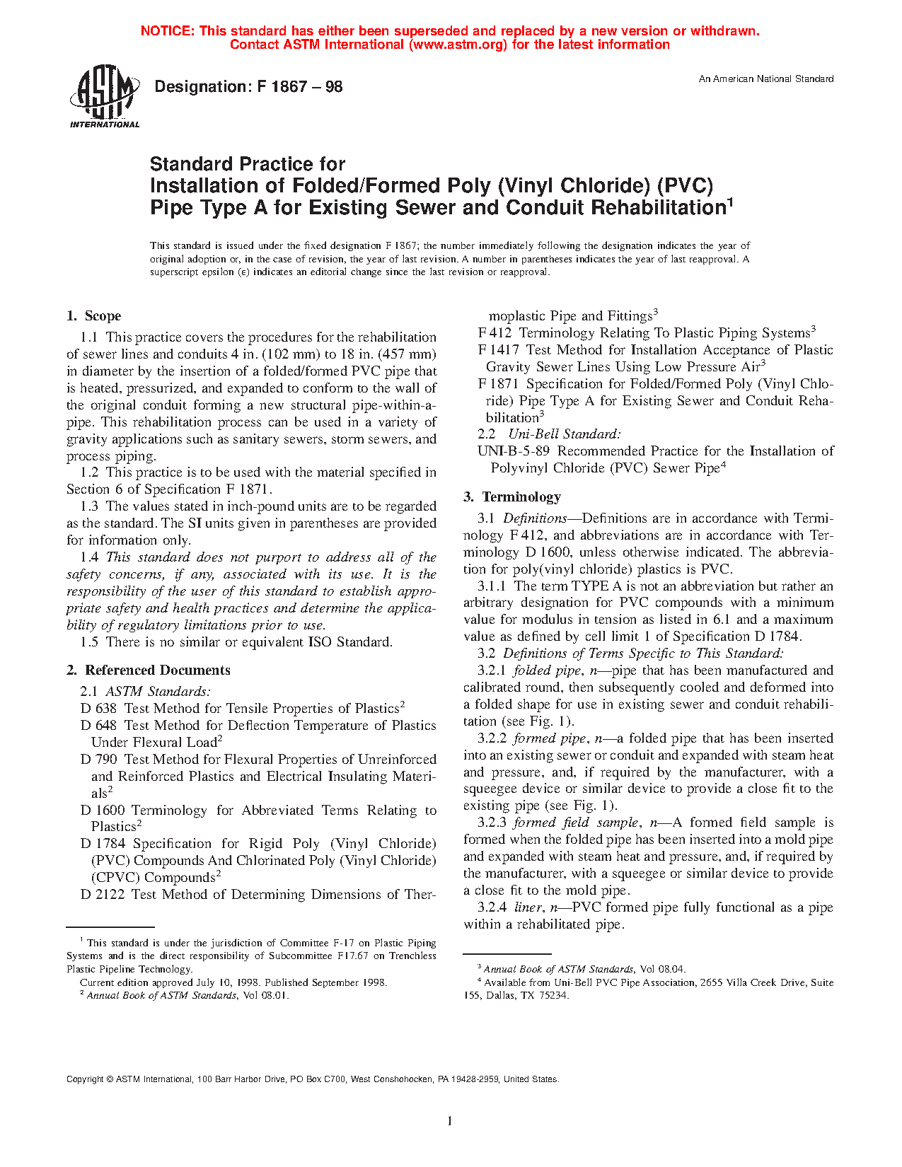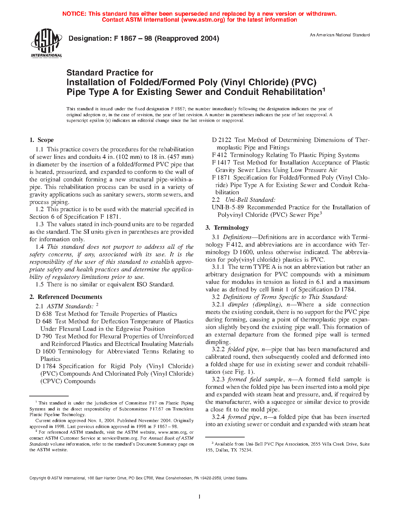 1.1 This practice covers the procedures for the rehabilitation of sewer lines and conduits 4 in. (102 mm) to 18 in. (457 mm) in diameter by the insertion of a folded/formed PVC pipe that is heated, pressurized, and expanded to conform to the wall of the original conduit forming a new structural pipe-within-a-pipe. This rehabilitation process can be used in a variety of gravity applications such as sanitary sewers, storm sewers, and process piping.