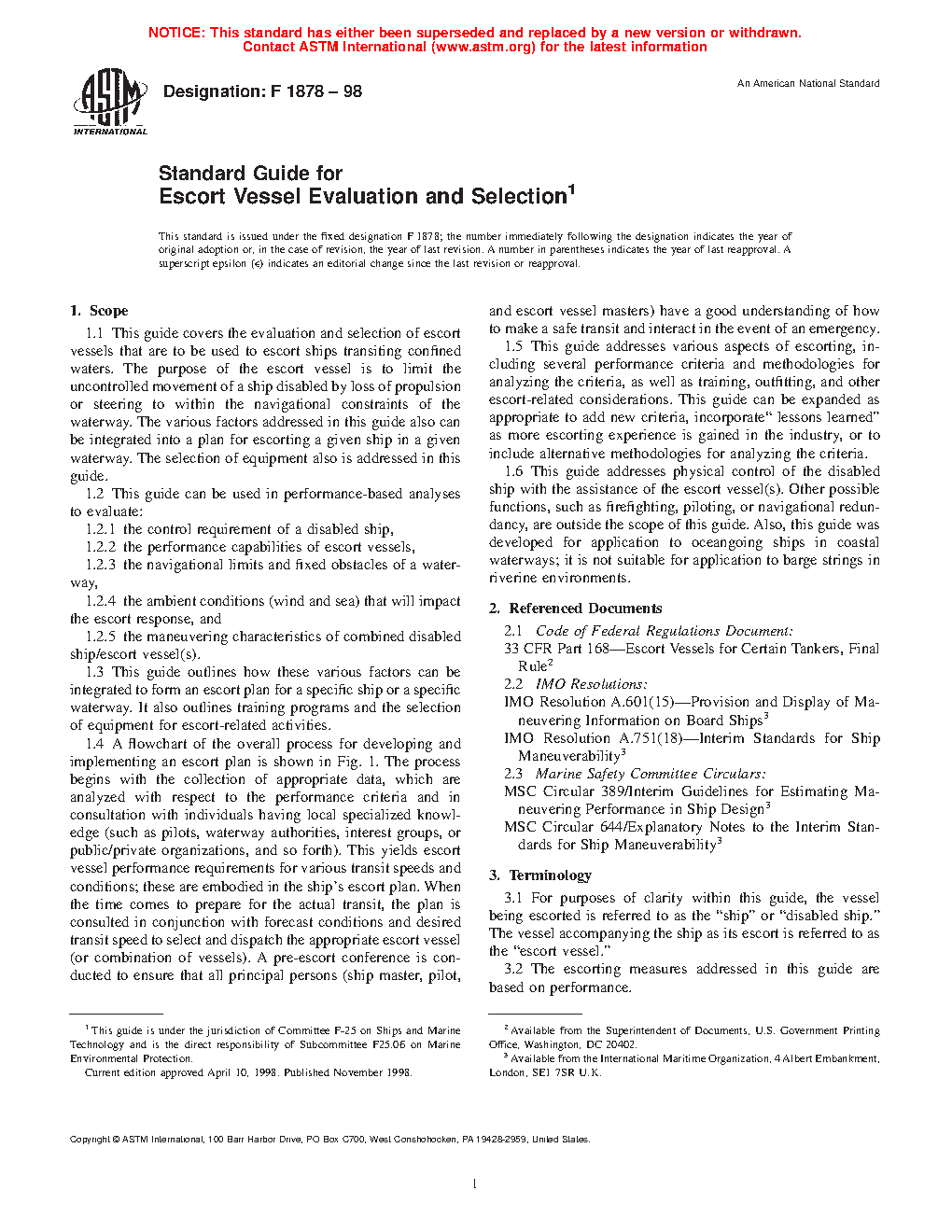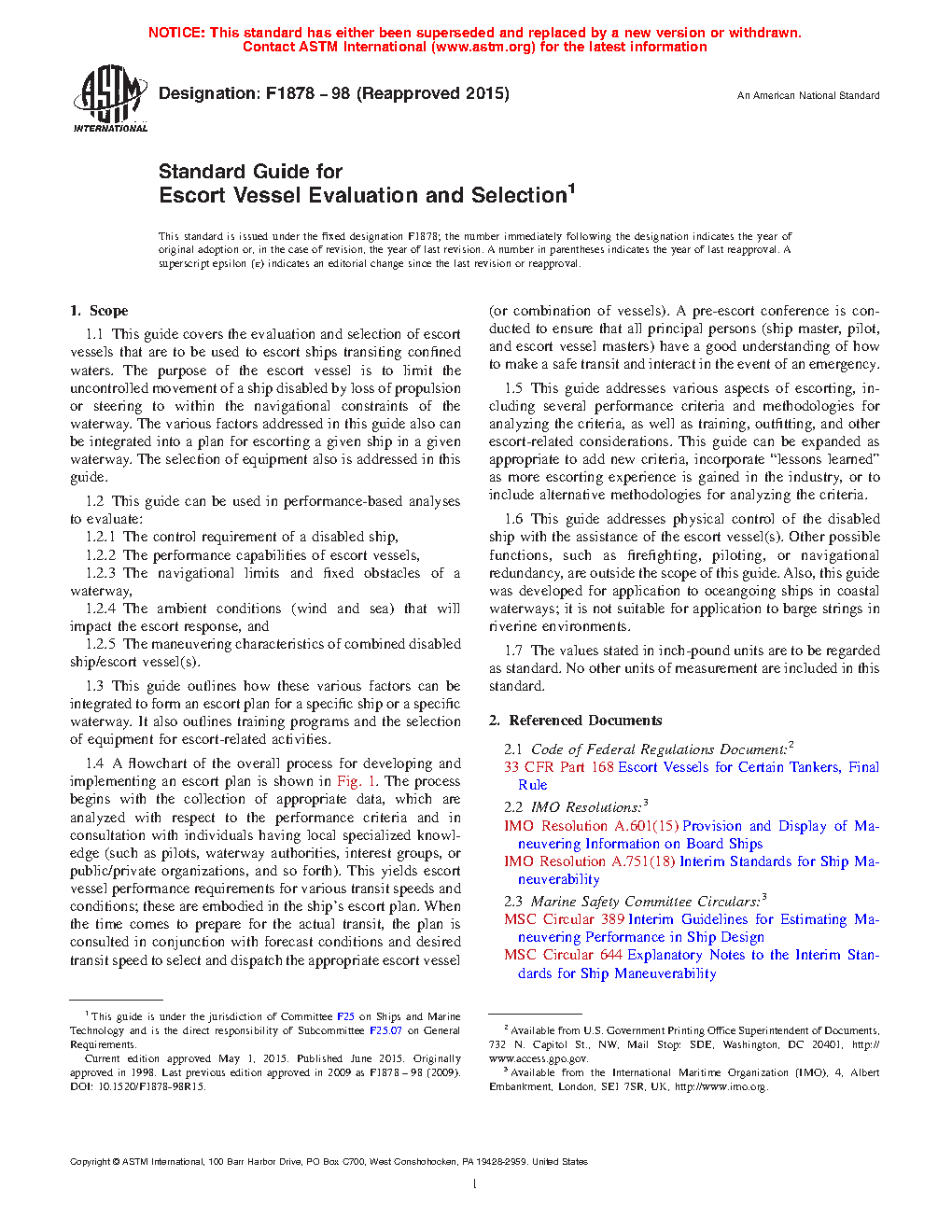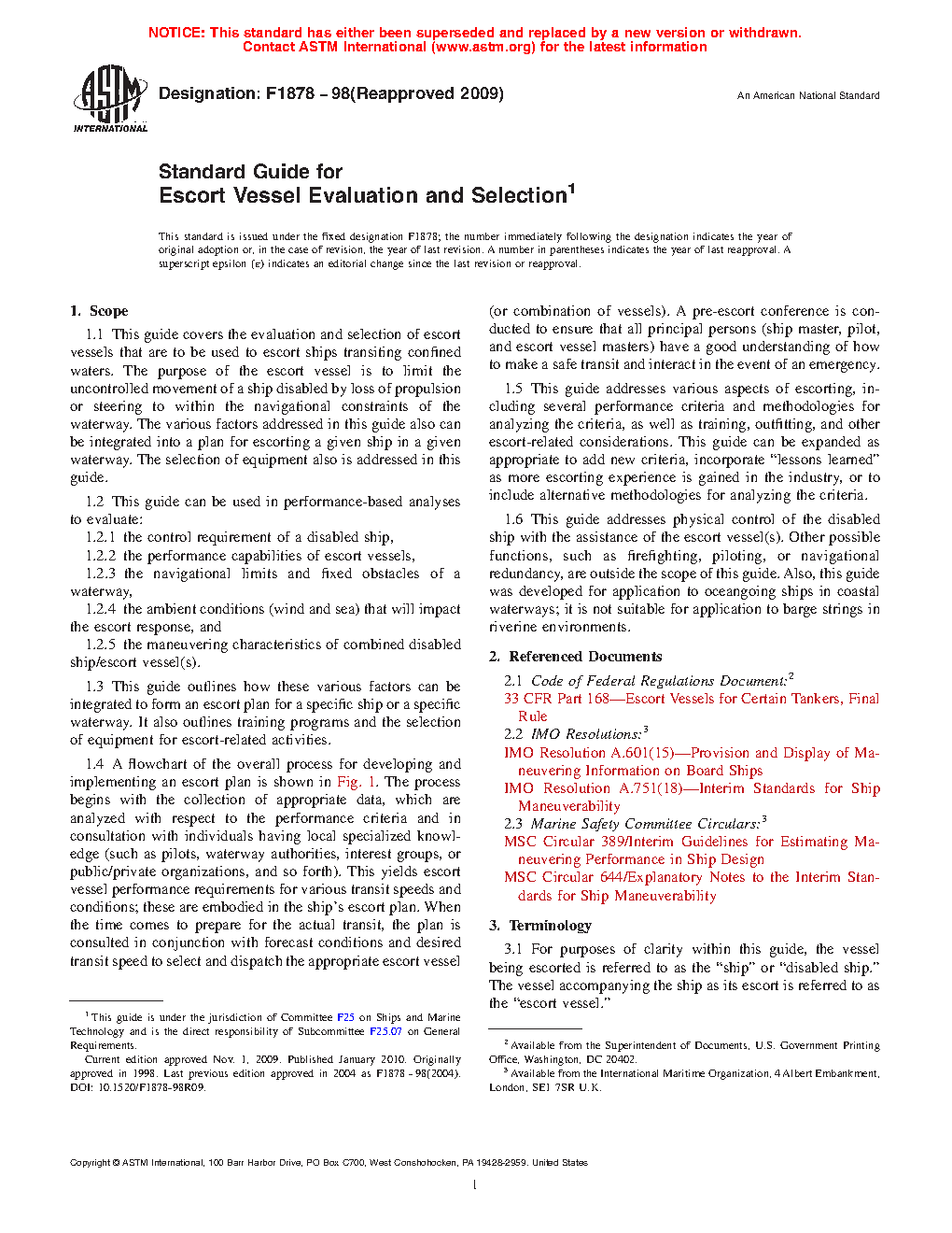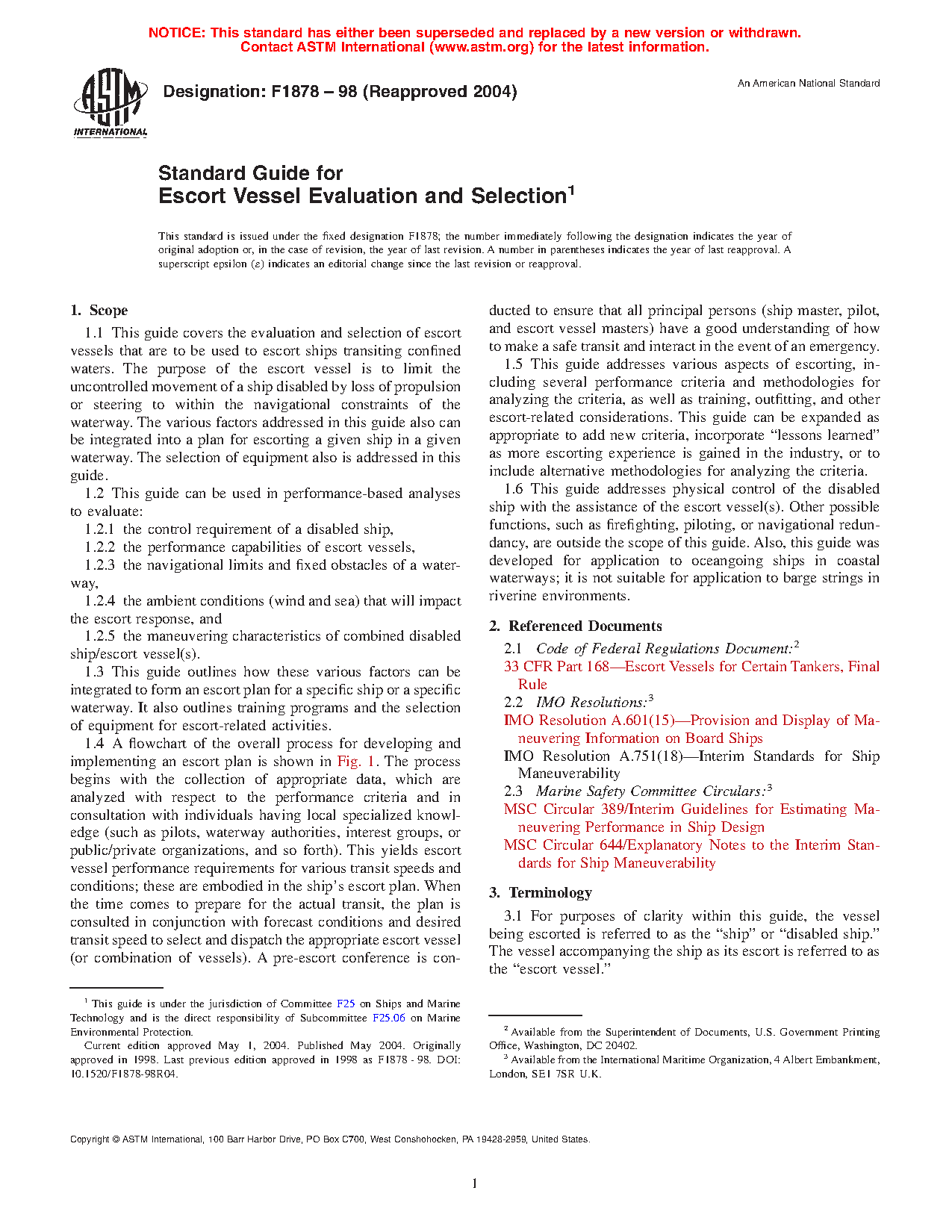 1.1 This guide covers the evaluation and selection of escort vessels that are to be used to escort ships transiting confined waters. The purpose of the escort vessel is to limit the uncontrolled movement of a ship disabled by loss of propulsion or steering to within the navigational constraints of the waterway. The various factors addressed in this guide also can be integrated into a plan for escorting a given ship in a given waterway. The selection of equipment also is addressed in this guide.