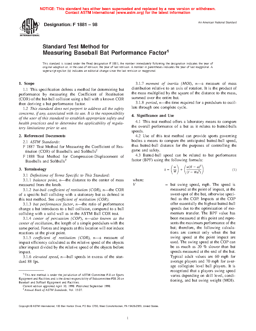 1.1 This specification defines a method for determining bat performance by measuring the bat-ball coefficient of restitution (BBCOR), deriving the bat performance factor (BPF), and calculating batted-ball speed (BBS). It is applicable to baseball bats of any construction or material. The method provides a quantitative measure of bat dynamic performance that may be used for comparison purposes.