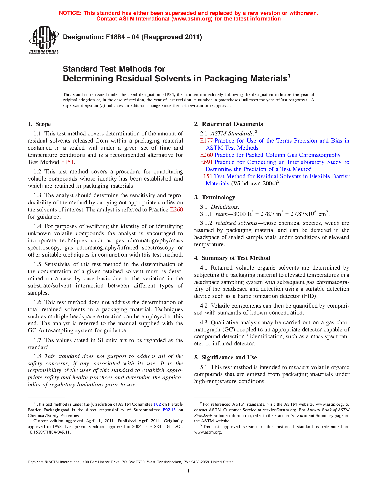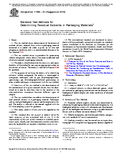 1.1 This test method covers determination of the amount of residual solvents released from within a packaging material contained in a sealed vial under a given set of time and temperature conditions and is a recommended alternative for Test Method F151.